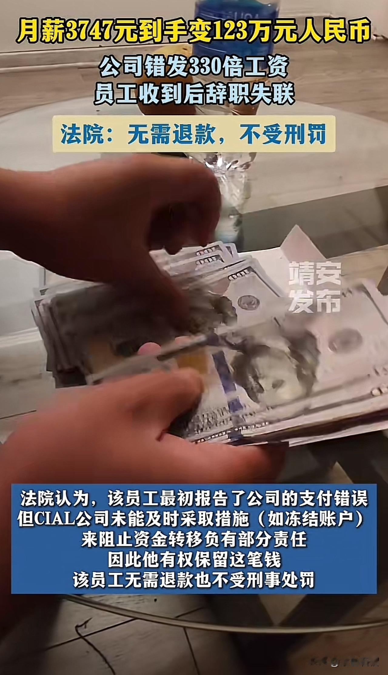 这位老兄运气太好了!简直就是中了500万大奖一样。 看了让人羡慕嫉妒恨。 智利一家生产冷切肉制品的发型企业支付系统出错,一个办公室助理竟然收到了1.65亿智利比索(相当于人民币123万)。要知道这个员工月薪只有50万比索,(相当于3700元人民币)。面对这笔天降横财,这名员立即辞职不干了。 结果公司将他告上了法庭,你猜结果怎么着?法院判这名员工无需退款,也不用受任何刑罚。原因是该员工最初报告了公司支付错误的情况但公司没有及时采取。 法院判决结果就是男子无需付出任何代价白白得了1.65亿比索。 对于这件事,大家怎么看呢? 图片来源网络
