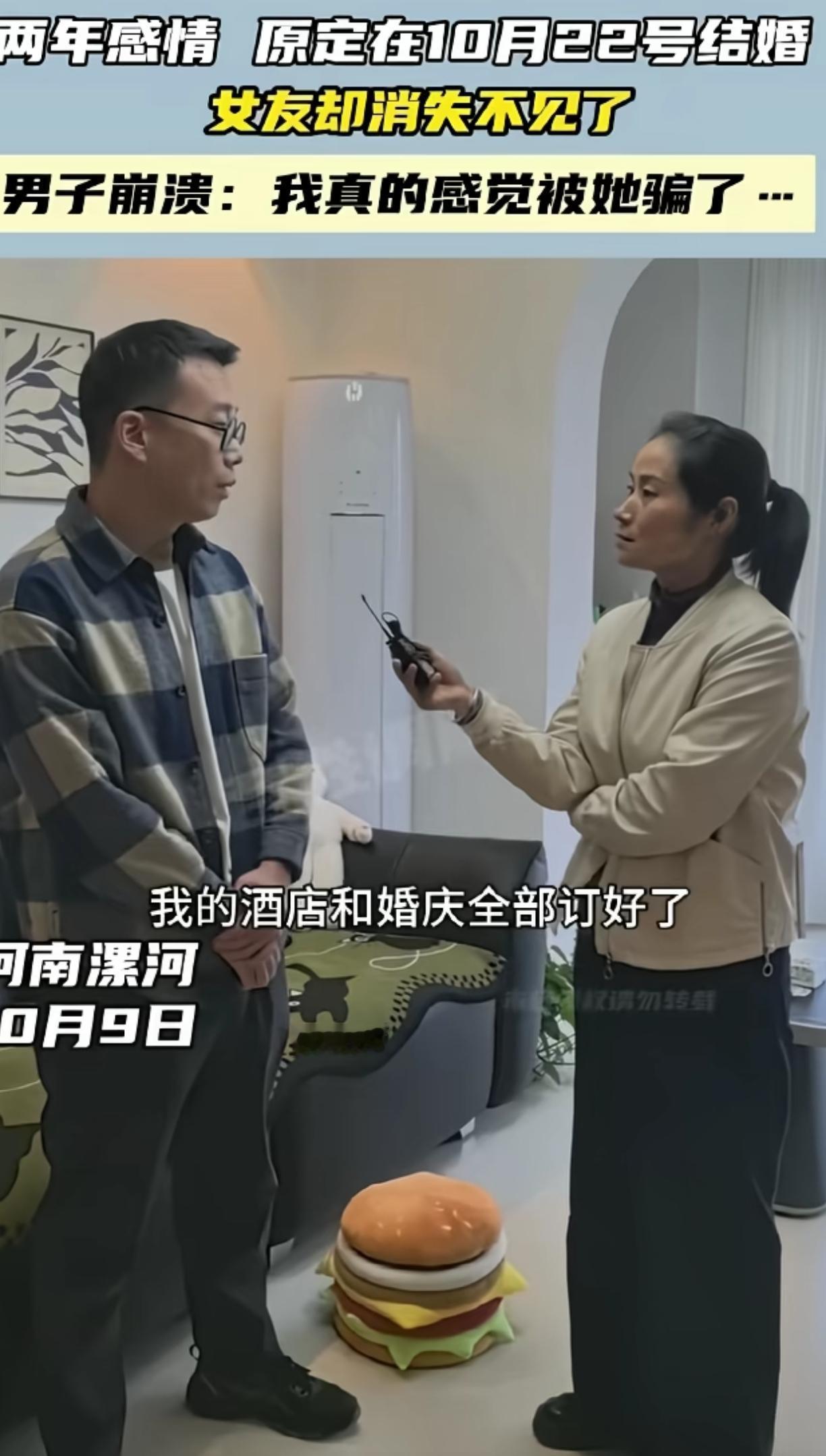 河南漯河这新郎也慌了 临近10月22号的婚礼 相恋两年的准新娘突然不见了 男子崩溃:我感觉好像被骗婚了 男子找到媒体帮忙,说自己22号要结婚,可突然新娘不见了,两人之前把酒店和国庆都订好了,觉得自己被女子骗了? 问及两人相识过程,男子说他俩是在抖音上的一个相亲平台认识的,第二次见面女方就提出拍婚纱照,男子没有拒绝,拍完婚纱照以后两人就开始了同居生活,同居了两个月后,女方提出订婚,要了3.6w的彩礼,两万的三金。 女方和自己相处了两年,现在跑了已经20多天了,去她家也找不到人。 不过有网友爆料,事情并不像男子说的那么回事,女方晒出了证据,谈了两年同居两个月,说到彩礼男方要求女方贷款结婚,女方说了一句“咋感觉有种自己贷款娶自己的感觉呢?”男方就破防了,语音说如果同意那就让女方父母退婚! 这男的看着这么老实……,真是人不可貌相啊~刚开始就装可怜骗同情,两年相恋彩礼一共5.6w,女孩也不是漫天要价的人,我还以为被骗什么了呢! 看完整个故事,我觉得女的才应该找记者,女的才被骗了,这男人真像一味无毒无味的毒药!