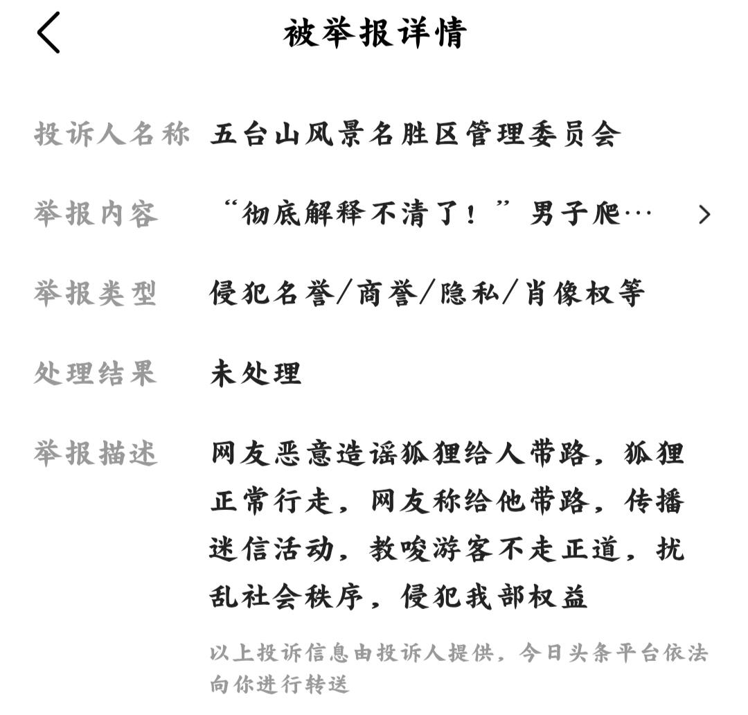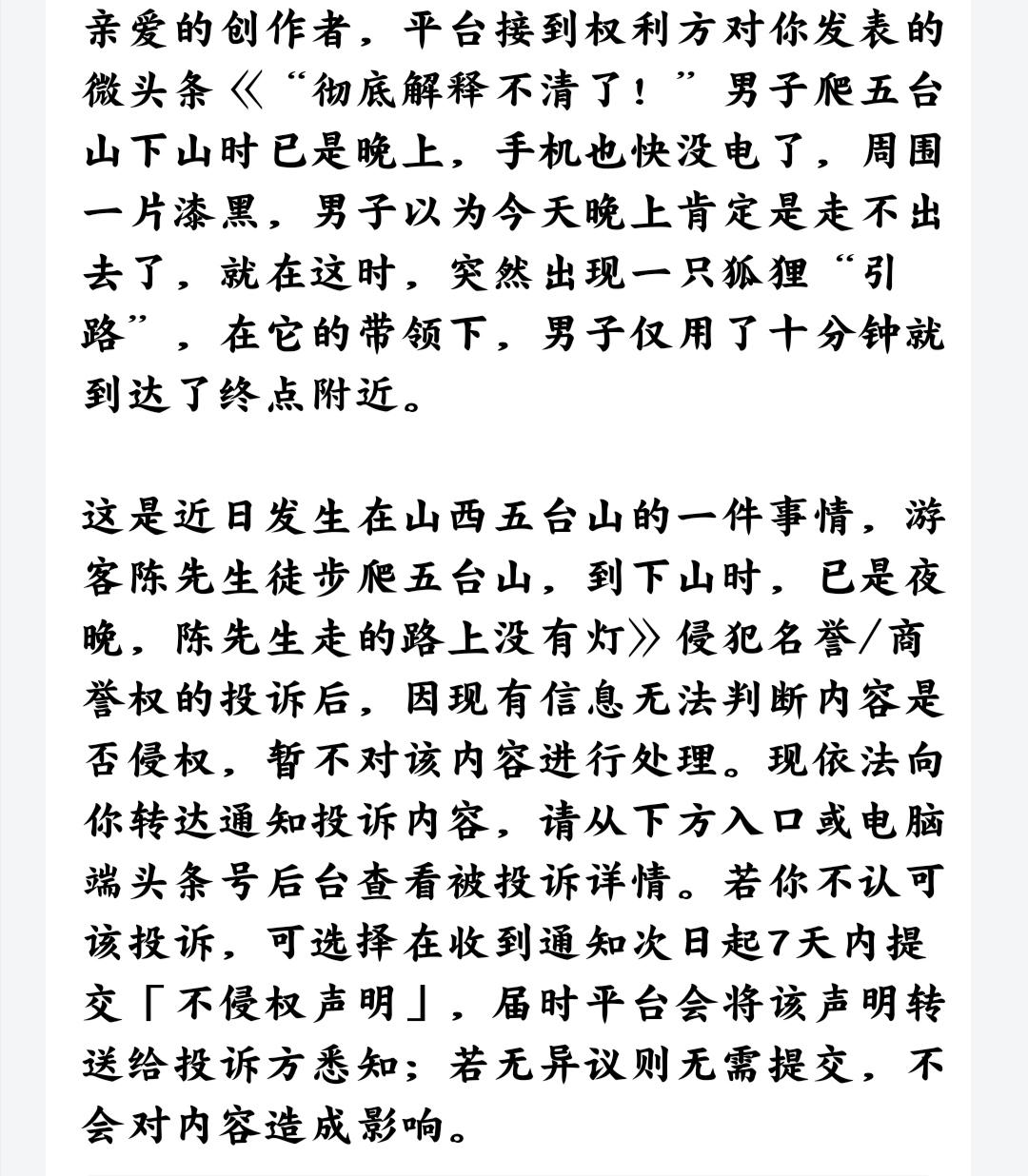 好家伙,昨天发了条关于五台山一游客遇狐狸“引路”的小文章,结果惊动五台山风景名胜区管理委员会了,真是活久见了! 那篇文章内容都是根据各大官方媒体报道信息所写,全然没有一点任何歪曲或者推测的事情,结果该管理委员会犹如惊弓之鸟一般,估计内容都没详细去看,就急着去处理内容。 他们投诉的理由是:“网友恶意造谣狐狸给人带路,狐狸正常行走,网友称给他带路,传播迷信活动,教唆游客不走正道,扰乱社会秩序,侵犯我部权益”。 这个屎盆子扣得,我是一脸茫然,我还特地山看了几遍那篇文章,只能感叹这位投诉的人员,是理解能力有问题呢?还是根本没去看文章,就一棍子打死! 其在投诉中指出的:网友称给他带路,并非我所说,而是五台山那名游客所说,我文章也有指出。所谓的传播迷信,更是子虚乌有,这一点,我在文章也给出了一个专家的解释,即可能就是碰巧的一个事件,结果此人估计是一点没看,就直接给我扣个恶意造谣、传播迷信活动的屎盆子! 说实话,这屎盆子扣的我,我也是有些惶恐啊!毕竟投诉方显示是五台山风景名胜区管理委员会啊! 不过呢,平台审核眼睛是雪亮的,对于此次投诉,平台也表示根据发布信息看,无法判定内容侵权,也并未对该内容进行处理,反倒是表示如果我不认可该投诉,可以选择提交不侵权声明,我反正也懒得去整那些,要上传不少资料,有些麻烦! 但想想心里有有些不舒服,被人莫名扣了一个屎盆子,总得发发牢骚吧!故而有了此篇,欢迎该管理委员会再次光临! 附上图片,以作证明!