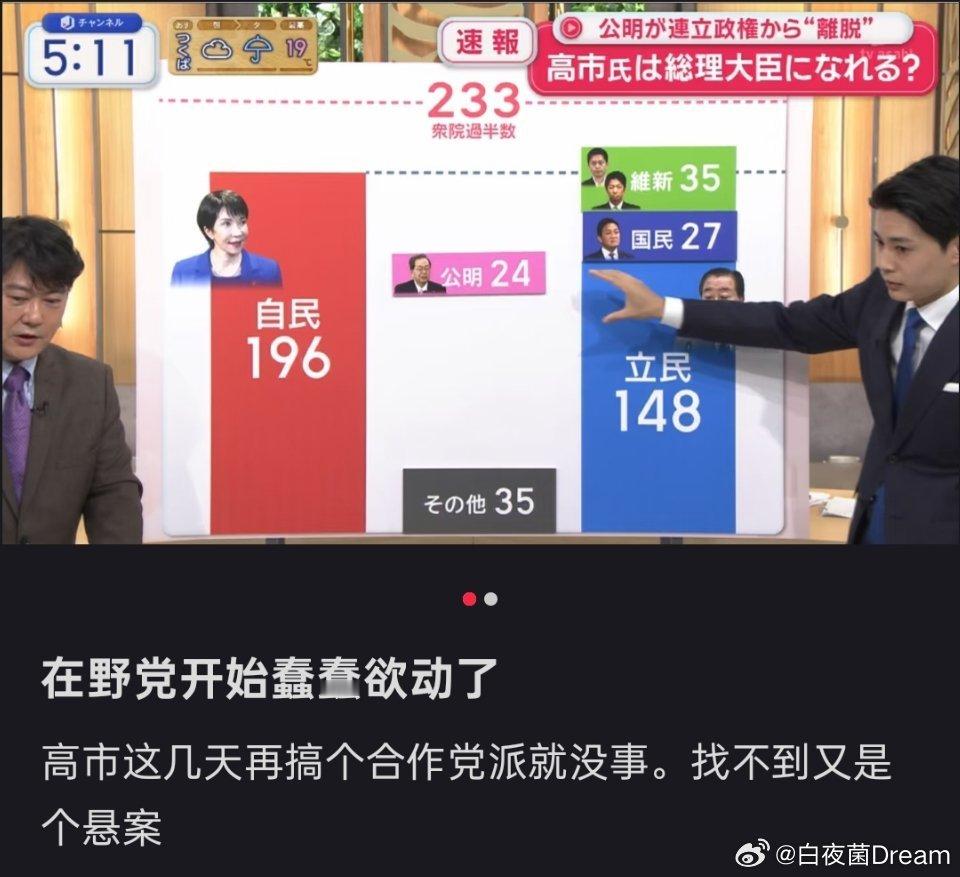 🔻玉木雄一郎宣布:我已经做好担任日本首相的准备了。由于日本公明党将脱离执政联盟,高市早苗目前的票数已经无法担任日本首相。