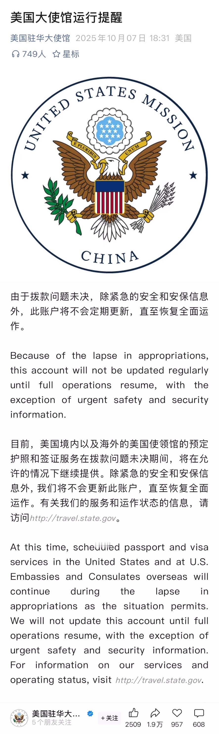 美驻华大使馆宣布微博微信停更停更原因竟然是没钱了![震惊]