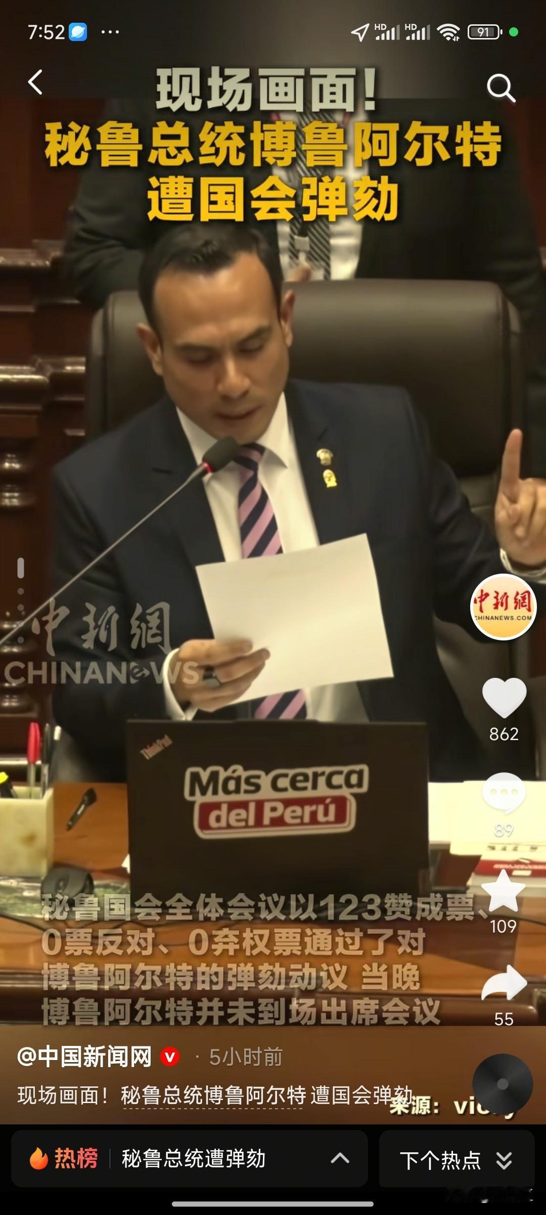 秘鲁总统遭弹劾,东大249亿投资恐生变! 外媒报道,当地时间9日晚上,秘鲁国会召开特别会议,成功弹劾了总统博鲁阿尔特,目前秘鲁总统职位暂时由国会主席兼任! 按照秘鲁多个党团的说法,他们弹劾总统是国内安全局势长期不稳,而10月8日秘鲁著名乐队在音乐厅遭遇武装袭击,更是成为弹劾总统的导火索! 不过,外界普遍认知拉美地区治安向来不算很好,因为治安问题弹劾总统过于儿戏! 还有一种传言认为,跟美国将战略重心转向拉美有关,而博鲁阿尔特这样相对亲中的总统必然成为打击的目标! 博鲁阿尔特2022年上台,2024年不顾国内的反对声浪访华,而当年的11月,中秘两国举行盛大仪式宣告由中方投资35亿美金(当时核249亿人民币)的秘鲁钱凯港正式开港。后续中国,秘鲁,巴西还再计划两洋铁路,这些以让美国坐立难安。美国认为这代表中国的影响力在拉美地区的扩张。 这次秘鲁总统被弹劾的背后如果只是国内治安问题还对华影响不大,如背后有美国的势力插手,那中国在秘鲁的大笔投资可能又将生变!