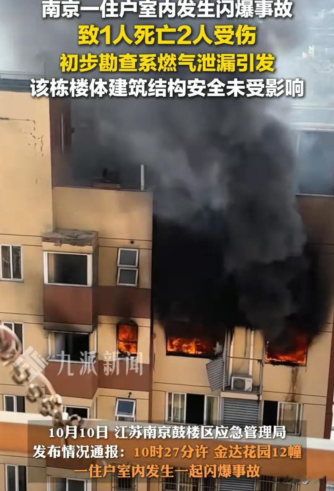 南京一小区突发闪爆致1死2伤,未波及周围住户。事发10月10日10点27分,南京市鼓楼区金达花园12幢,一住户室内因煤气泄漏而发生房屋闪爆起火事故。 事发后,附近居民就报警并协助救援,最终事故造成该户居民1人死亡,2人受伤。事故没有引起其他住户损失,楼房结构和安全没有受到影响,消防员提醒一定要安全用电用气,正确安装检测装置。 南京一小区发生闪爆致1死2伤