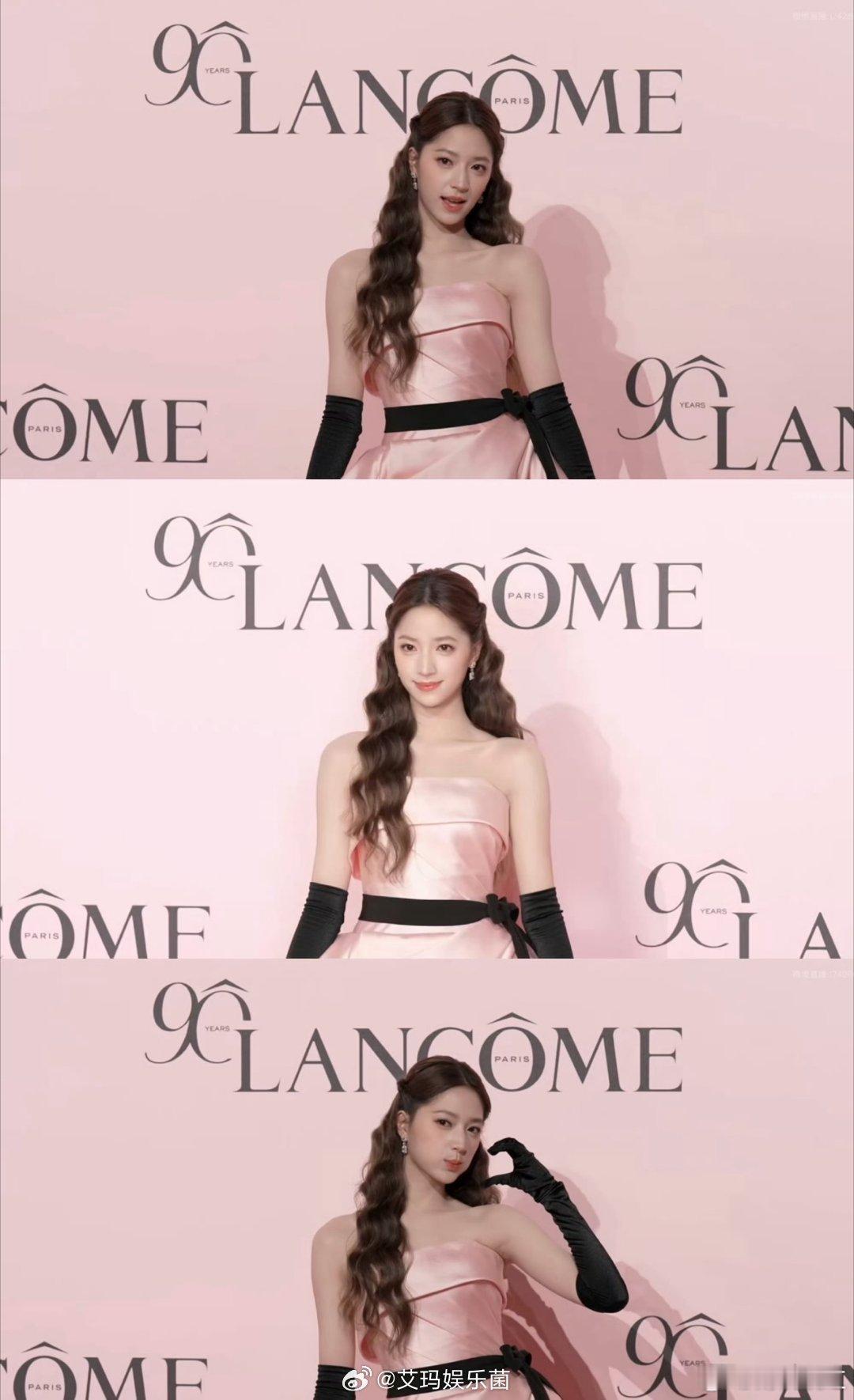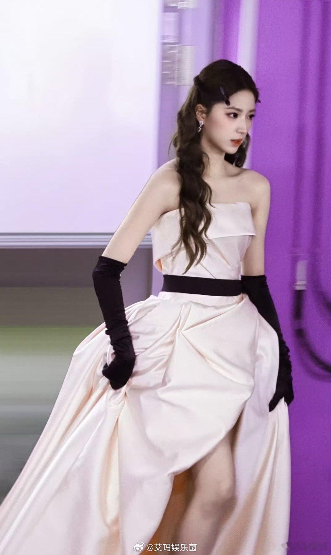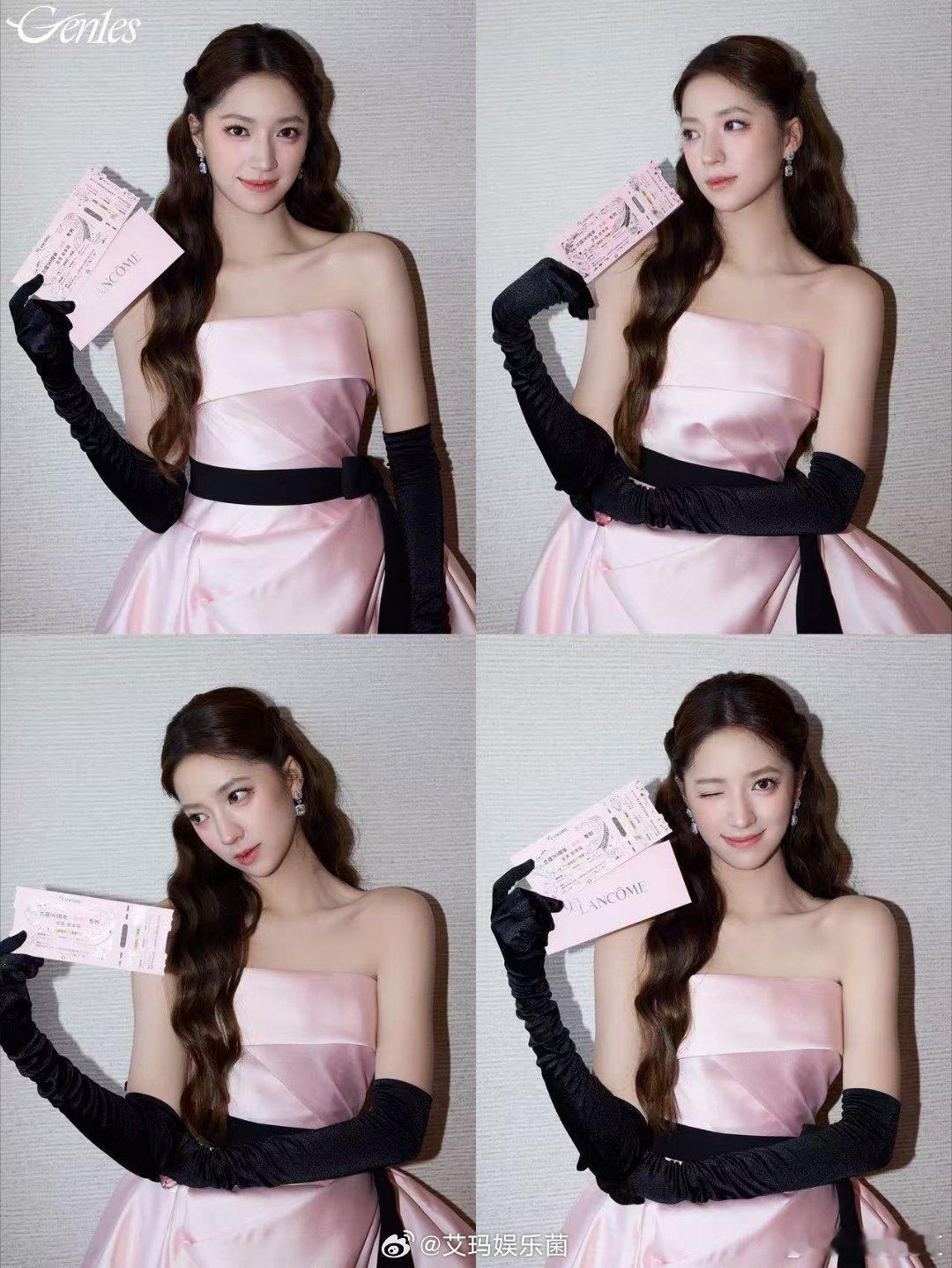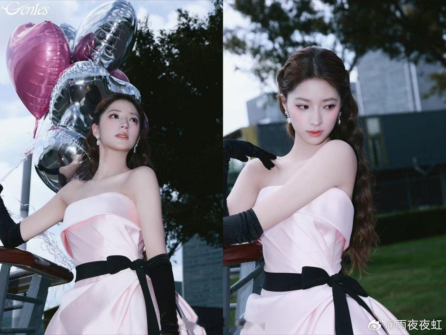 欧阳娣娣看得出她是公主 粉色抹胸长裙配黑色长手套太绝!温柔卷发衬得她优雅又灵动