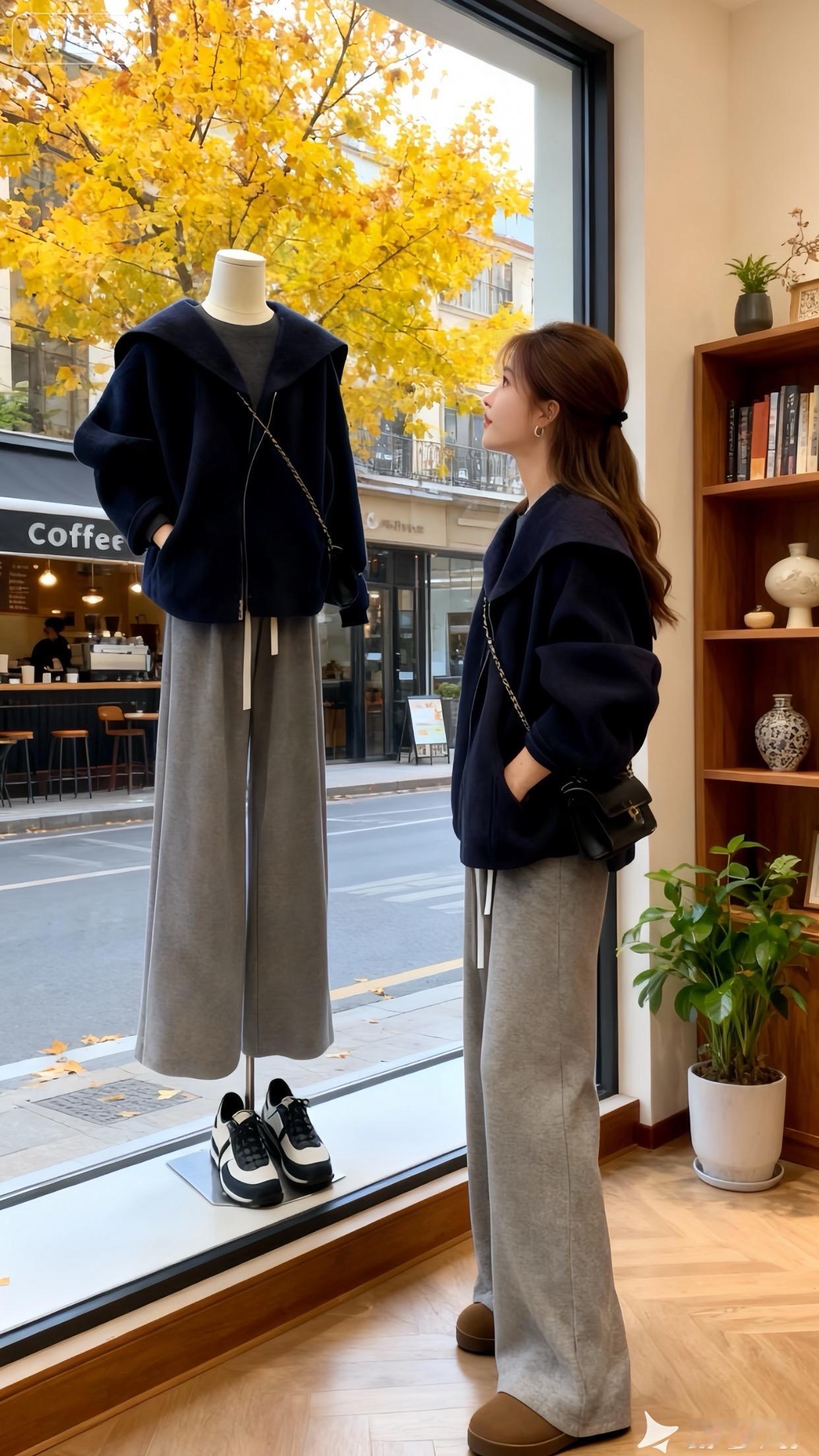 秋冬锁这套!海军领外套+阔腿裤韩系。秋冬还在纠结穿什么?这套海军领毛呢外套+垂感阔腿裤直接锁死!藏青色外套复古显白,大翻领设计谁穿谁嫩~搭配灰色阔腿裤,显瘦又显高,日常出街、通勤上班都能打!关键是这套搭配不挑身材,微胖姐妹也能轻松驾驭,穿上就有一种韩系欧尼的既视感,氛围感直接拉满~秋冬穿搭 韩系穿搭 显瘦套装高级感穿搭