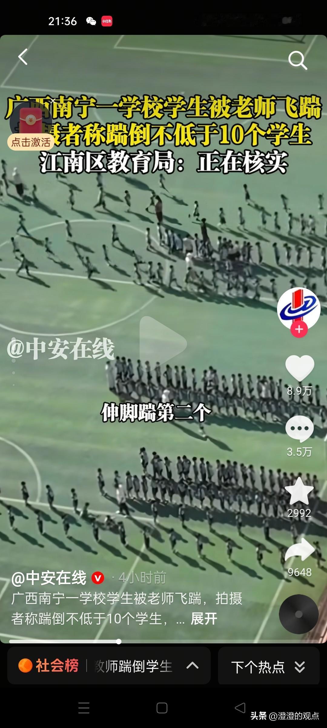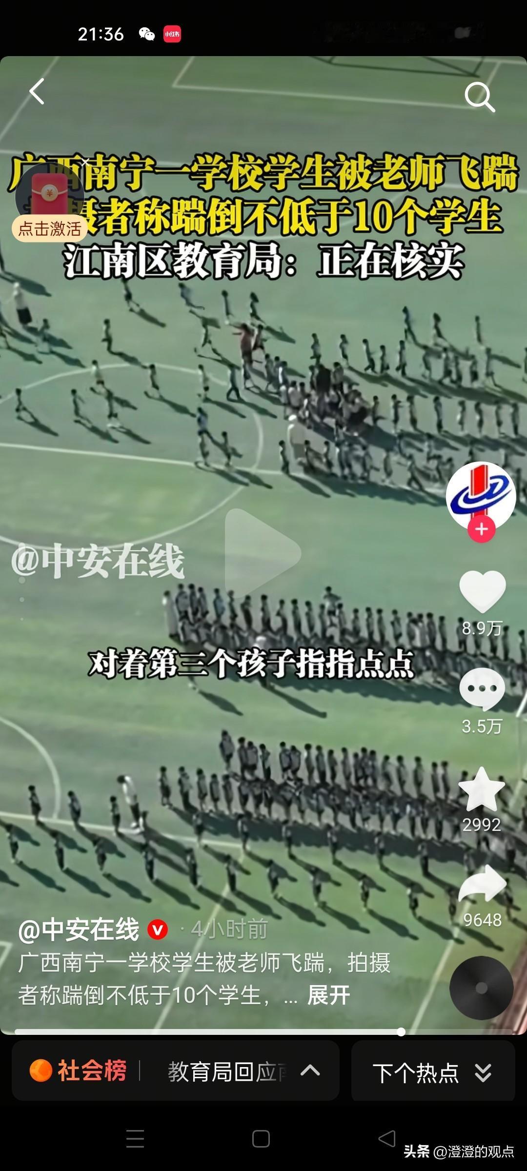 广西南宁某学校,一名老师竟然在操场上对多名学生连续飞踹!😡 现场视频里能看到孩子被踢倒的画面,拍摄者说“至少踹倒了不下10个学生”……(视频目前已有176万播放,全网都在关注) 目前江南区教育局回应:正在紧急核实情况。希望尽快有个明确的调查结果! 不管发生了什么,老师这样的行为都太过了!孩子有错可以教育,但暴力绝不是解决问题的方式。校园应该是安全的地方,而不是让家长提心吊胆的地方💔 希望每一个孩子都能被温柔以待,拒绝教育暴力! 南宁老师飞踹学生 校园安全引关注