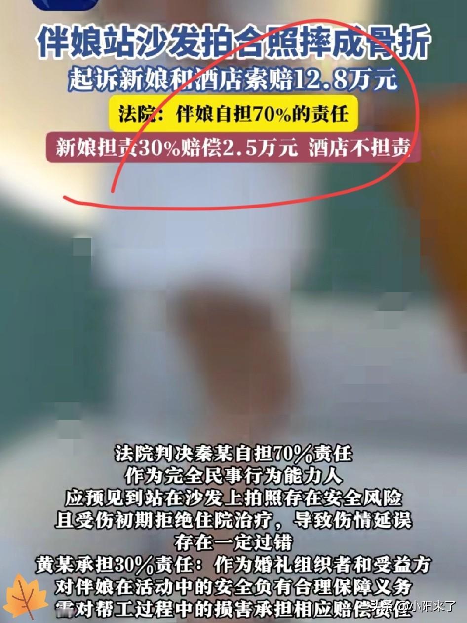 脸都不要了!陕西西安,一女子要举办婚礼,就邀请好友来当伴娘,婚礼上想拍张合照,几人站上沙发摆姿势,结果沙发突然滑了,闺蜜直接摔成骨折! 康复后闺蜜把新娘和酒店告上法庭,要12.8万赔偿,法院的判决却让不少人醒了神! 法院说酒店没责任,沙发没装轮子,没人能预料到会有人站上去;闺蜜作为成年人,没提前想到站沙发的危险,得担7成责任;新娘是主家,没提醒大家注意安全,担剩下3成! 这事看着是场意外,其实藏着提醒别拿“热闹”当借口忽略风险,成年人要对自己的选择负责,主人家也得把安全放在人情前面! 大家对此有什么看法?