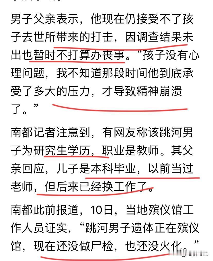越来越不简单!跳河新郎之父再发声!新郎是本科毕业,之前当过老师。仍在等调查结果,暂不打算办丧事。 新郎父亲称想要知道我孩子跳河的原因,至今还没调查清楚。孩子没有心理问题,到底承受了多大的压力,才导致精神崩溃了。 之前都在传新郎研究生毕业,职业是老师,这次新郎父亲辟谣了,之前是当过老师,后来换了。 什么琐事杀伤力这么大,一定要调查清楚。 两人于2年前订婚,给了女方20万彩礼和四金,东拼西凑在西安准备一套婚房。 据说男方在这近两年一直催促女方跟自己领证。直到10月3日办婚礼还没有领取。这又是为何呢?经过多次沟通,女方才同意完婚。 结果婚礼当日还是出事了,男的突然下车摔下手机,向河边狂奔,还说对不起父母,最后一跃而下。 司机也说两个人在车上一直吵,新郎结婚之前和结婚当日到底承受了多大的压力突然去跳河?估计新娘心里是清楚的。 现在的车上都有行车记录仪和录音吧,何况是婚车。新娘应该出面解释,必竟是多年的恋人。 现在的孩子、什么都不跟父母讲,父母还真不一定知道什么原因。 如果走到结婚这一步了,双方父母没必要为难孩子,为难还不如不结婚,或许双方父母都给了压力。