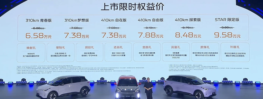 一共 6 个配置,续航分 310km 和 410km 两档。入门的 310km 青春版限时 6.58 万,顶配 STAR 限定版 9.58 万。