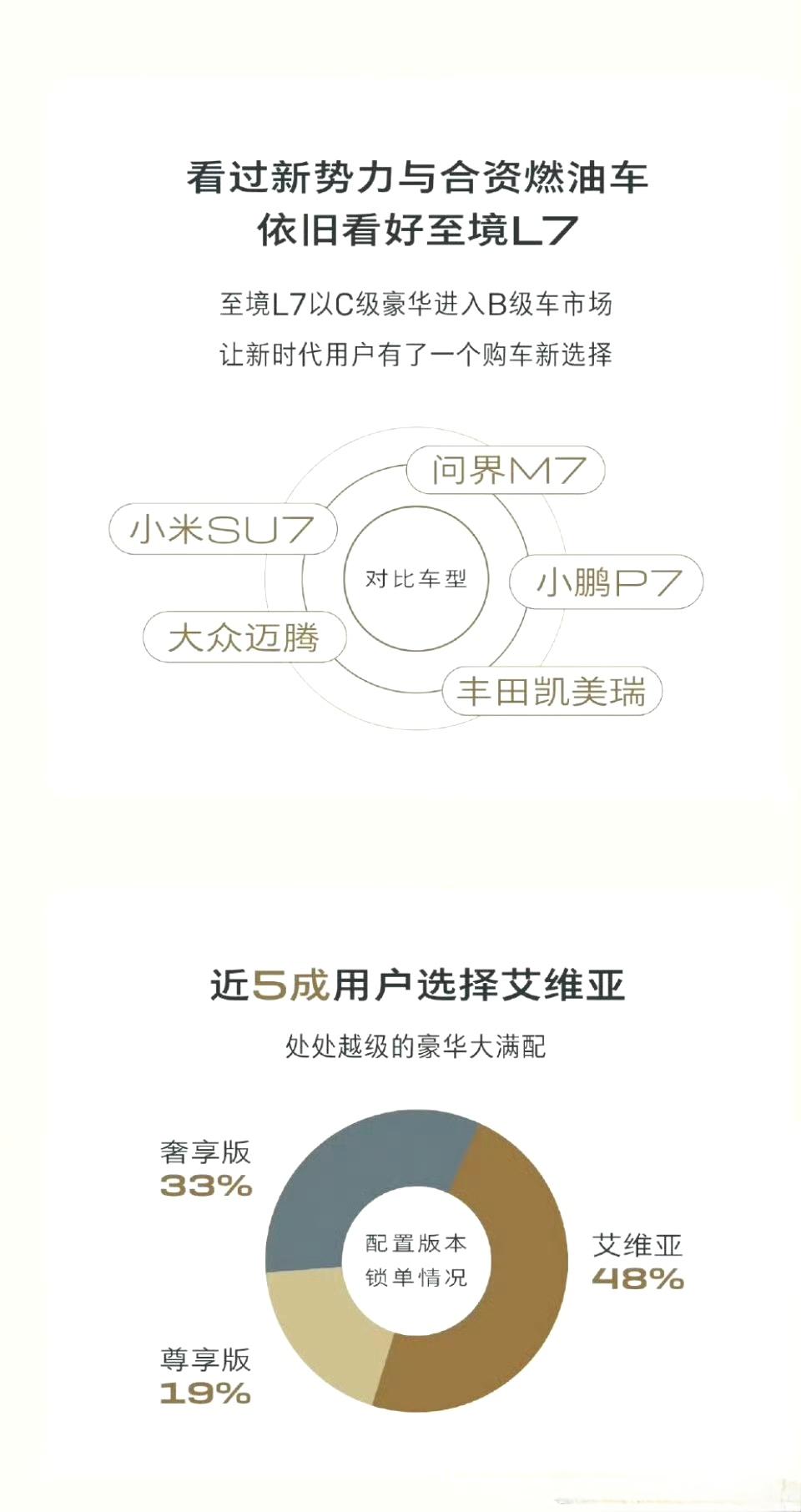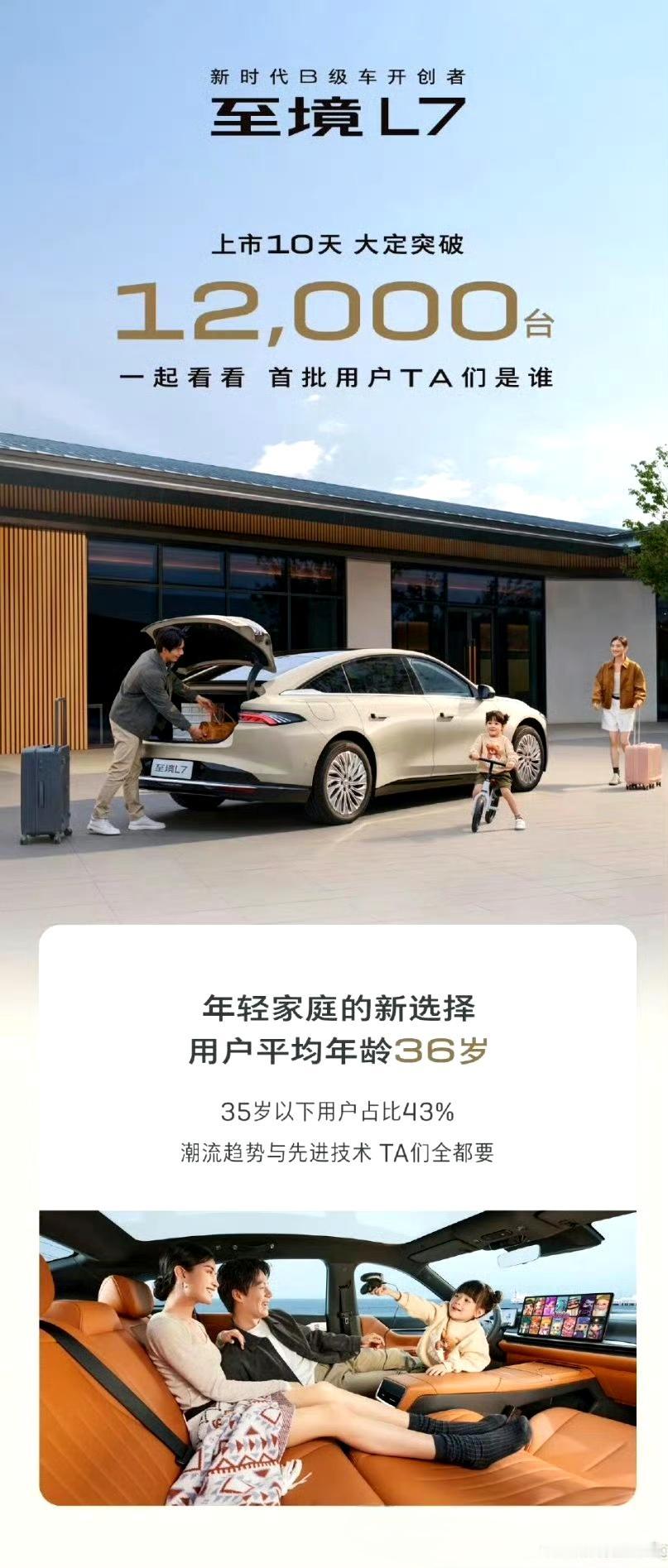 别克至境L7公布了大定数量,10天突破12000辆,非常不错的成绩。 至境L7的平均用户年龄是36岁,算是成熟的中产家庭了。 对比车型,竟然还有小米SU7以及问界M7,这一届消费者看车范围比较广。 将近50%的消费者选择了艾维亚车型,这车不买顶配确实挺亏的。【来自懂车帝车友圈】