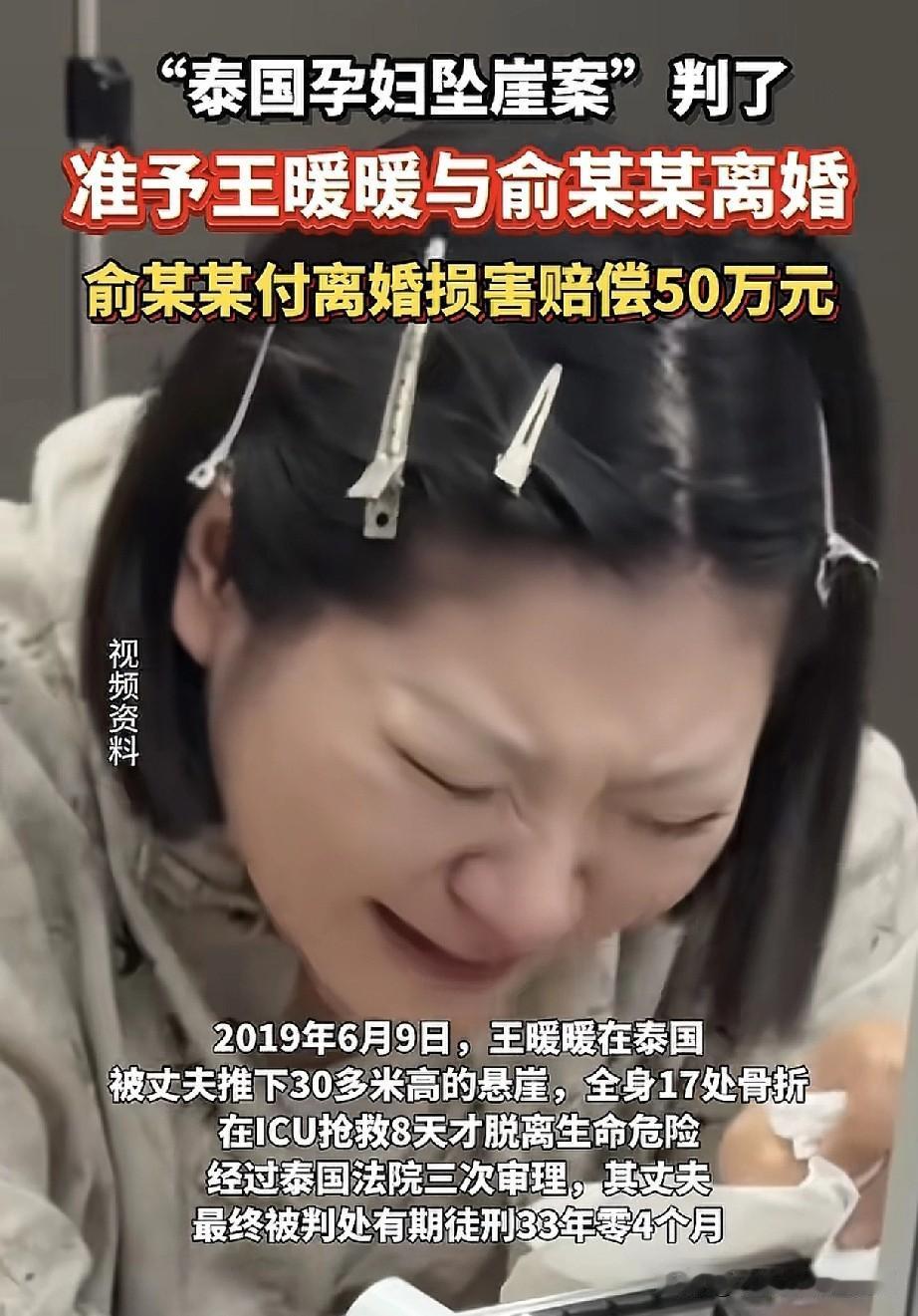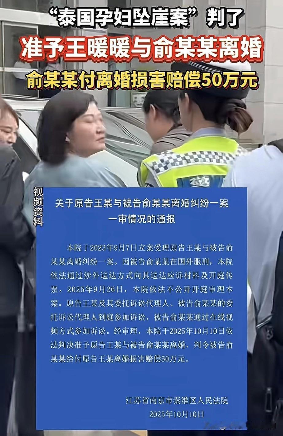 一觉醒来,王暖暖等了两千多个日夜的离婚判决终于来了 今天上午,南京市秦淮区人民法院的一纸判决,为持续六年的泰国坠崖孕妇案离婚纠纷画上句号。法院准予王暖暖与俞某冬离婚,并判令俞某冬支付离婚损害赔偿50万元。 从2019年6月9日被推下34米高崖那一刻算起,王暖暖用了2300多个日夜才真正摆脱这段婚姻。这起被称为国内首例被告在国外服刑的离婚案,创下了涉外司法实践的多个先例。 案件最大的障碍在于俞某冬正在泰国服刑33年零4个月。泰国不是海牙送达公约缔约国,诉讼文书送达需要外交渠道周转,光确认对方收到文件就要数月。最终庭审通过视频连线完成,俞某冬在泰国监狱在线出庭。 离婚诉讼期间,俞某冬曾提出3000万元离婚费要求,声称是精神和青春损失费。这种诉求在法律上完全没有依据,最终法院判决反而要求过错方向受害方赔偿。 王暖暖去年生下孩子后,因婚姻关系存续曾面临孩子落户难题。如今离婚判决生效,她将真正开启新生活。这个案例让很多身处复杂婚姻中的人看到,法律终究会保护无过错方的权益。