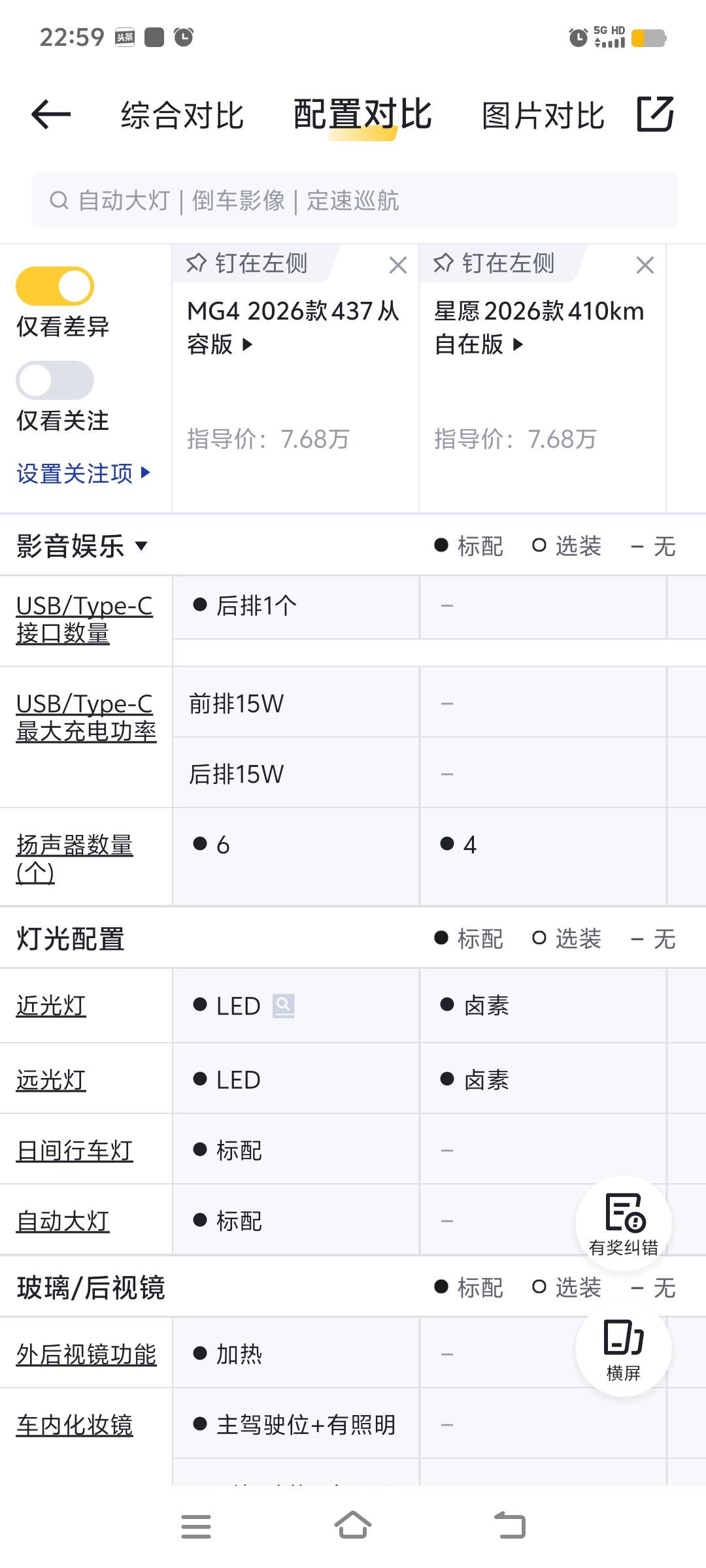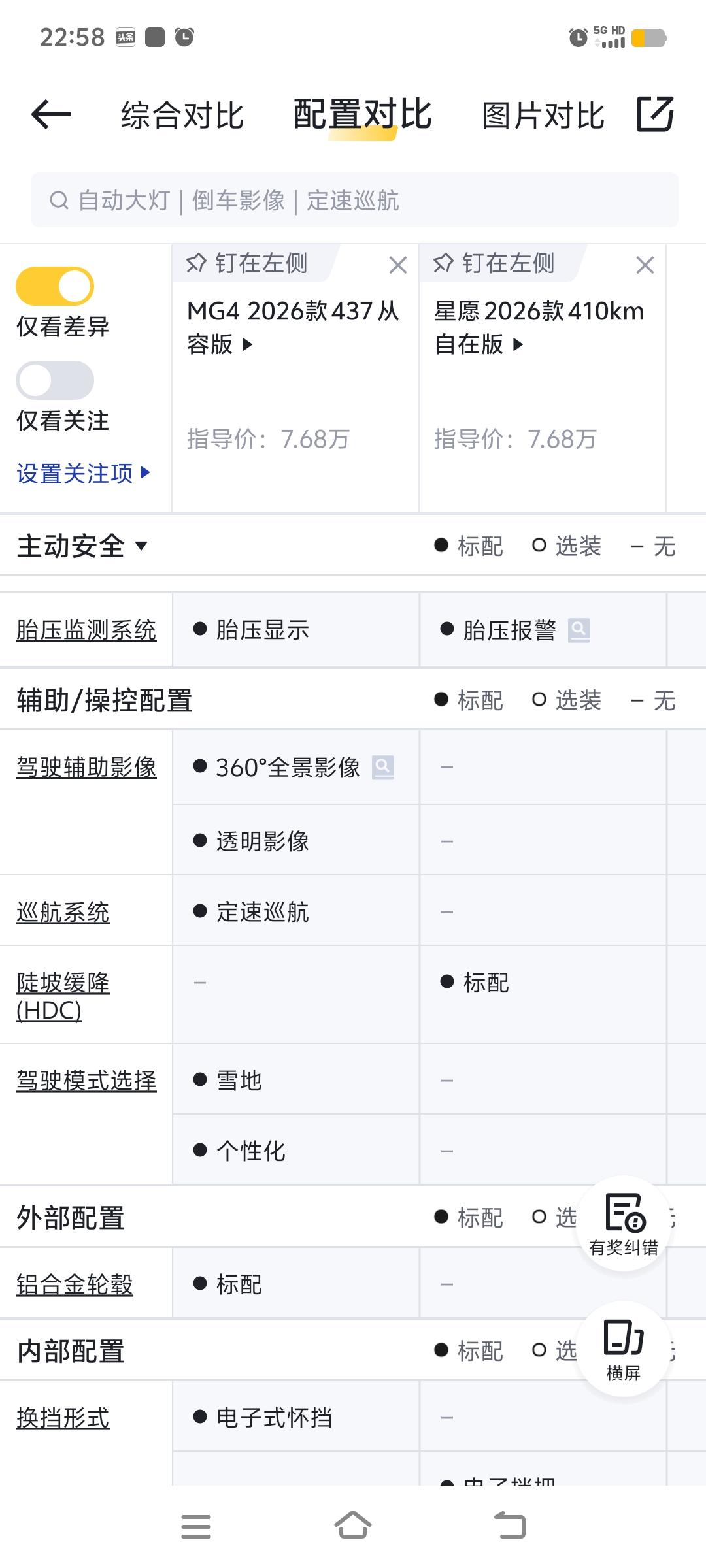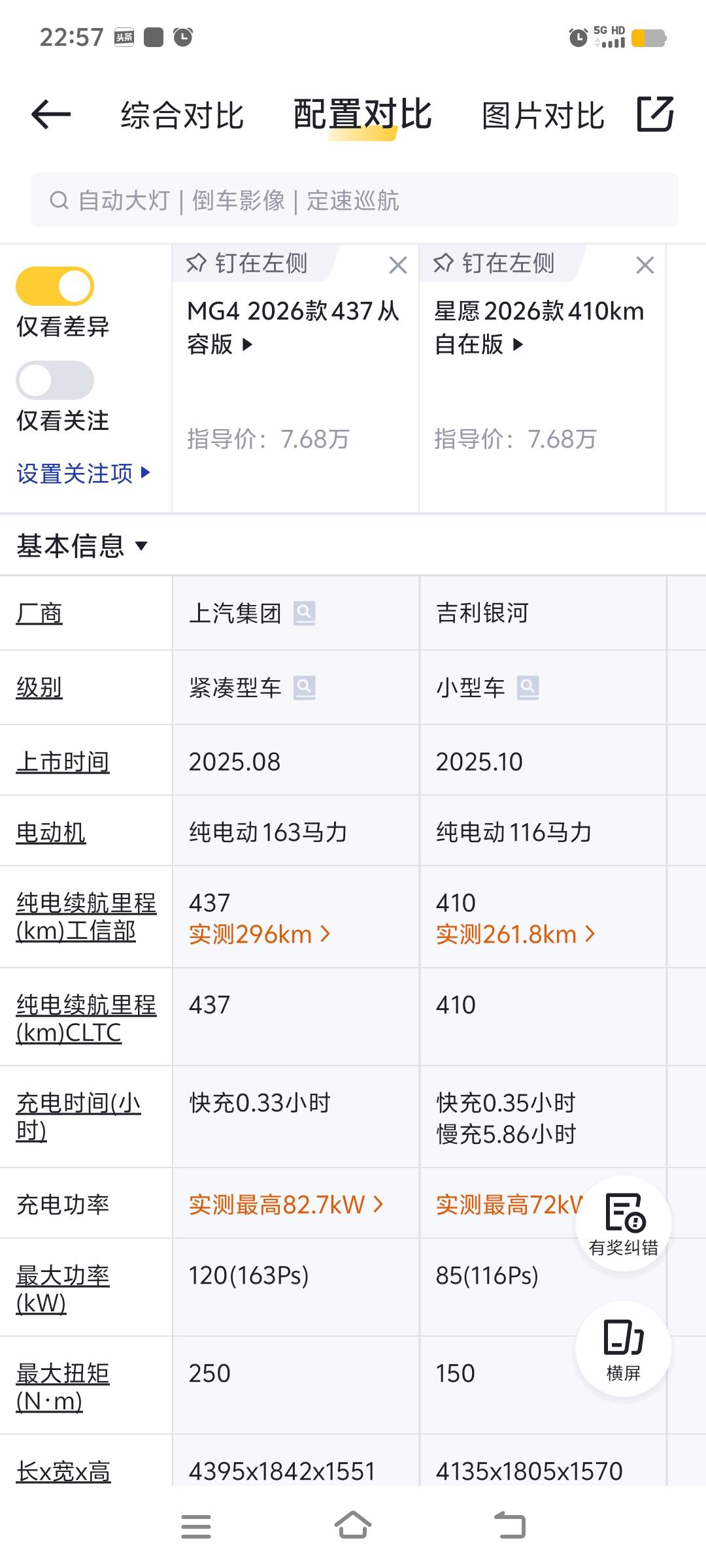 白色截图部分都是名爵MG4同价格比2026款星愿更多的配置。 咱们不吹不黑哈,星愿也有优点,就是 1.吉利品牌大。 2.电池宁德时代。 3.独立悬架。 4.麋鹿测试更快。 下面截图可以看出,名爵4的配置简直比星愿多了太多太多,尤其是用于中长途驾驶的,定速巡航星愿居然没有,要知道,现在五菱面包车手动挡都有定速巡航。 名爵mg4 MG4 EV 吉利星愿