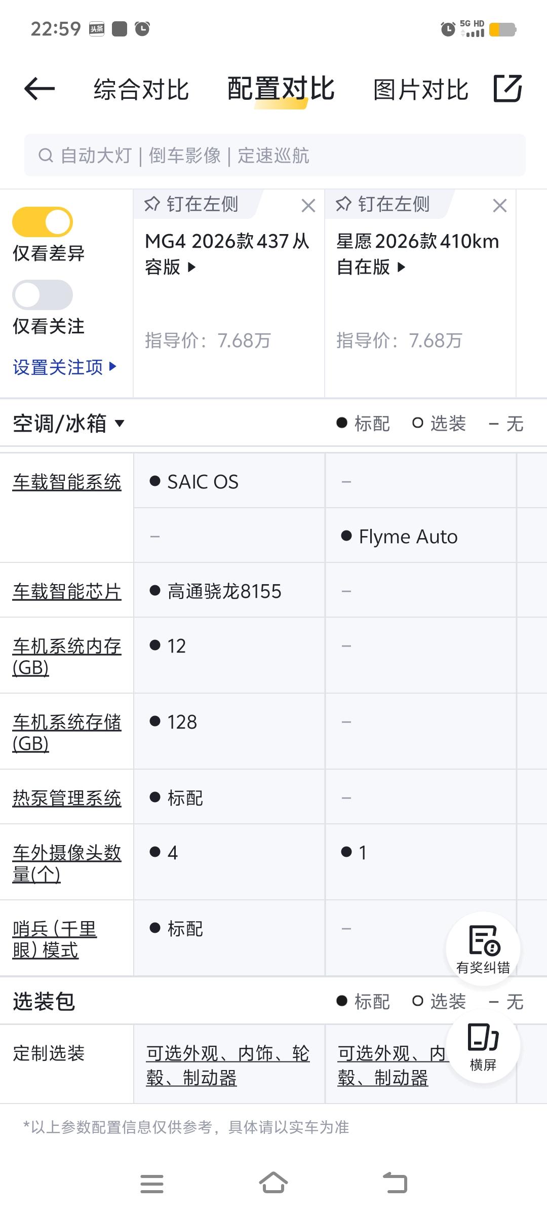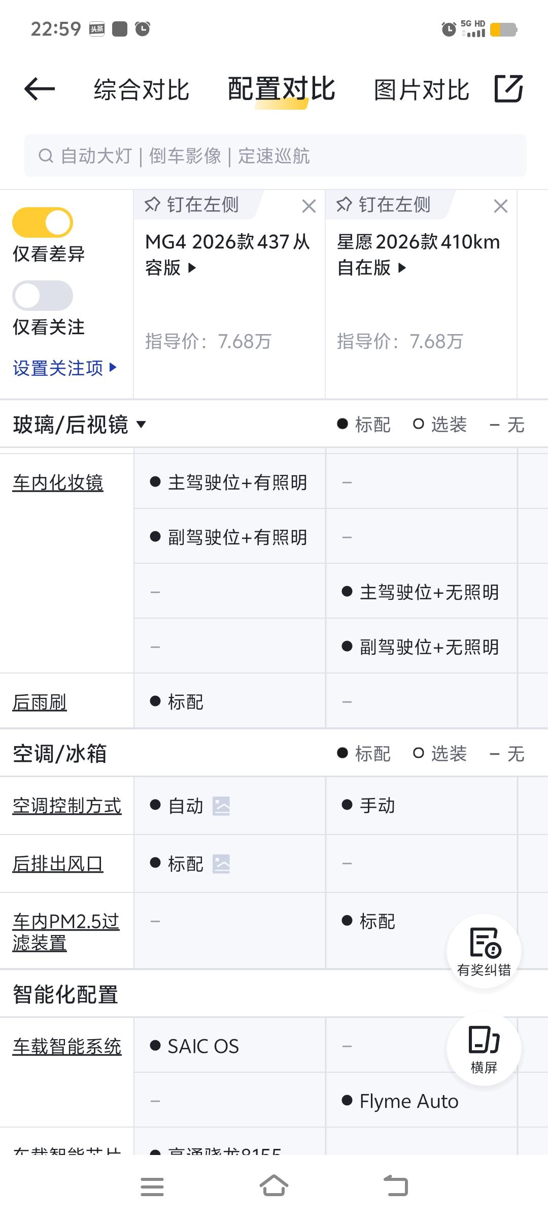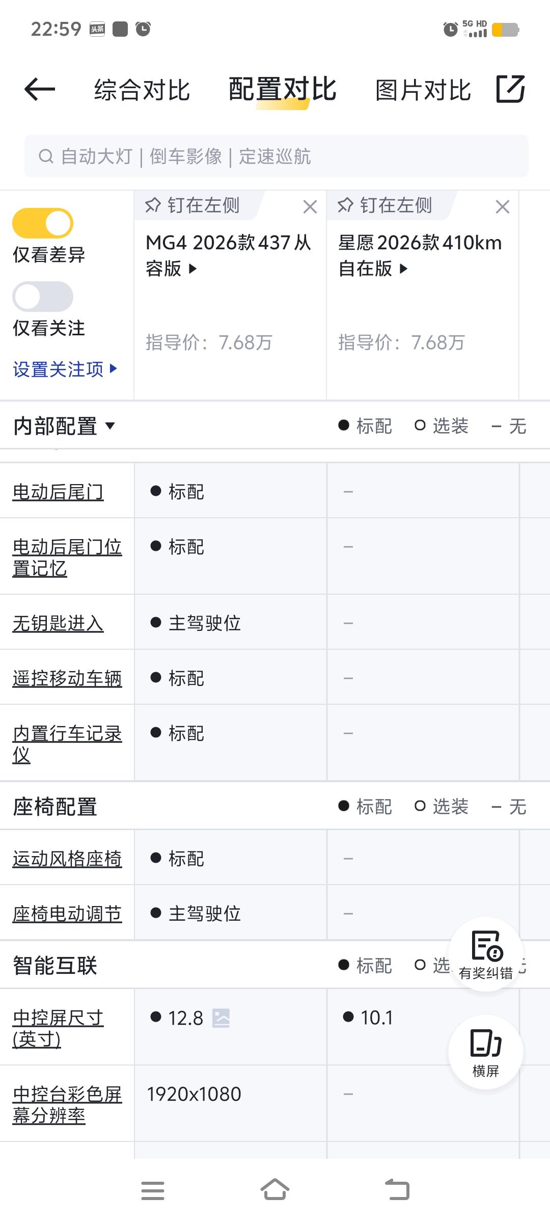 白色截图部分都是名爵MG4同价格比2026款星愿更多的配置。 咱们不吹不黑哈,星愿也有优点,就是 1.吉利品牌大。 2.电池宁德时代。 3.独立悬架。 4.麋鹿测试更快。 下面截图可以看出,名爵4的配置简直比星愿多了太多太多,尤其是用于中长途驾驶的,定速巡航星愿居然没有,要知道,现在五菱面包车手动挡都有定速巡航。 名爵mg4 MG4 EV 吉利星愿