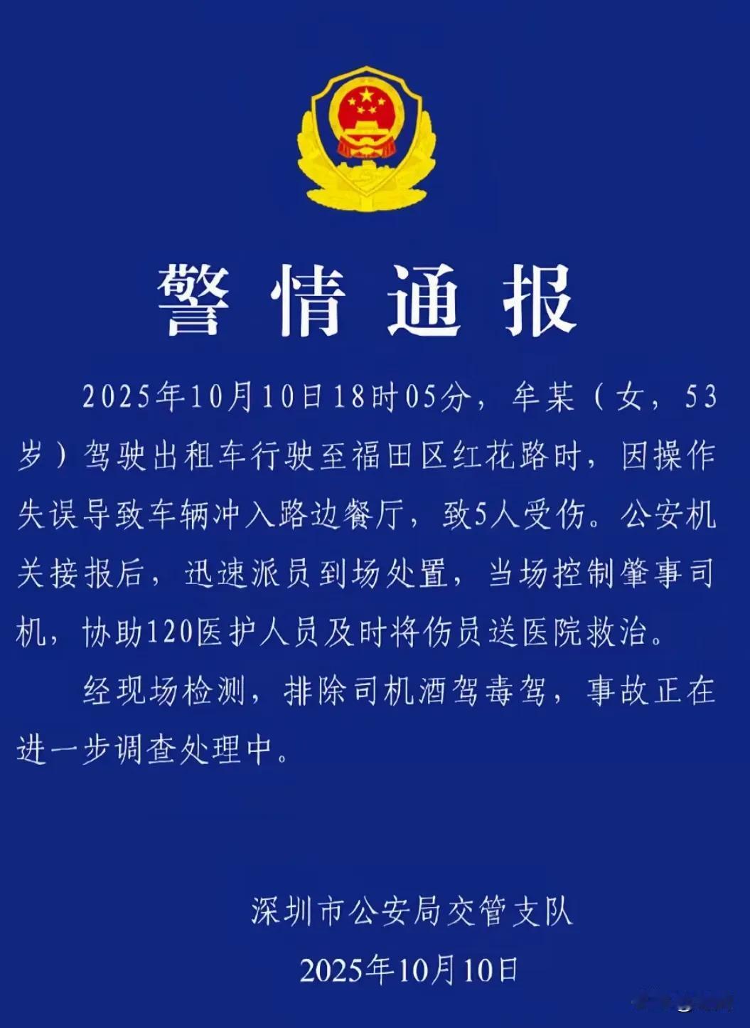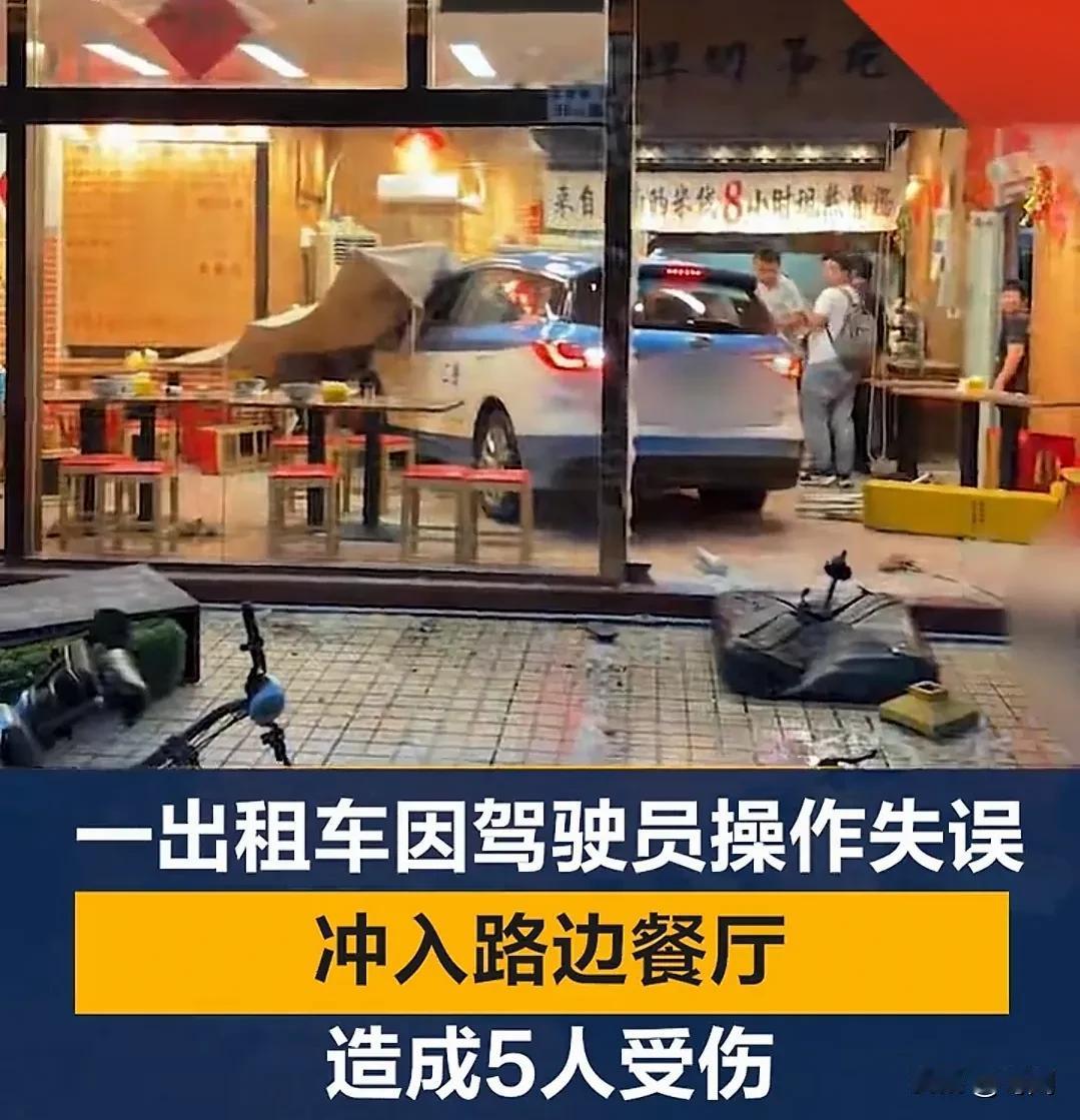 女司机驾驶出租车冲进餐厅导致5人受伤!事发10月10日下午18点过,在深圳市福田