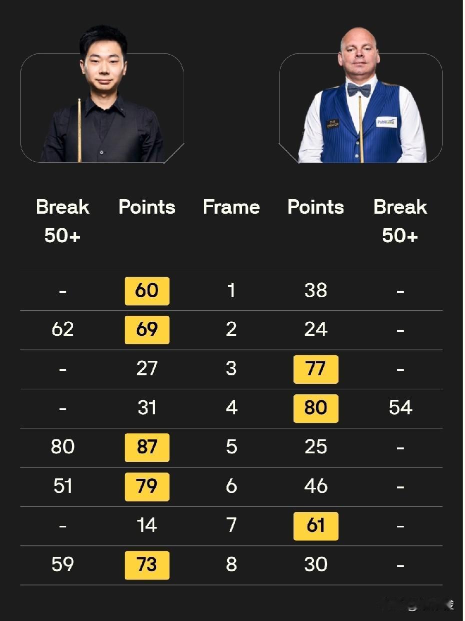 西安大奖赛8强出炉,刚刚,吕昊天5-3战胜宾汉姆,搭上8强末班车。其他7人是:墨菲、加里·威尔逊、威尔斯、普伦、丁俊晖、火箭奥沙利文、马克·威廉姆斯。 今晚最后一场结束的比赛刚刚结束,吕昊天5-3艰难战胜宾汉姆,搭上了8强末班车。这场比赛,双方简单失误都很多,好在吕昊天抓住了机会。 今晚其他3场比赛的结果是: 丁俊晖5-1胜奥利弗·莱恩斯,火箭奥沙利文5-2胜杰克·琼斯,马克·威廉姆斯5-4逆转绝杀霍金斯。 至此,西安大奖赛第四轮全部结束,丁俊晖和吕昊天两名中国球员晋级8强。 明天是西安大奖赛1/4决赛时间,8名选手为争夺4强席位而战。4场比赛的时间和对阵如下: 14点: 普伦vs威尔斯 吕昊天vs马克·威廉姆斯 19点30分: 丁俊晖vs墨菲 火箭奥沙利文vs加里·威尔逊。