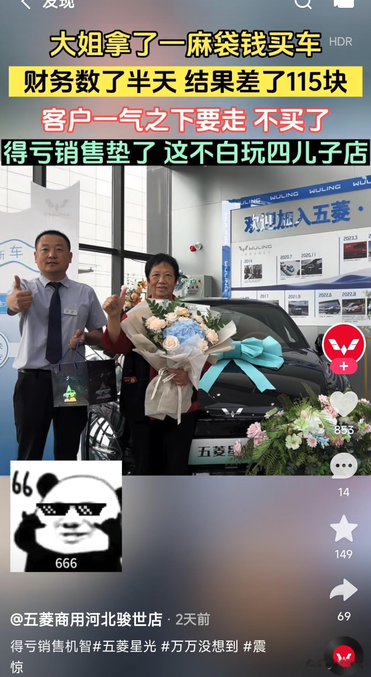 大姐拿了一麻袋钱买车,财务数了半天,结果差115块,大姐一气之下不买了要走,幸亏销售灵机一动给垫了,要不白玩四儿子店了。 这大姐还是挺聪明的,钱别人帮着数了,车也买了,这属实是一举两得,这销售也算是没有白在四儿子店里混,一百来块和一辆车的销售业绩他还是分的清楚的,这到手的业绩咋能因为一百来块钱给白白从手里跑掉呢,如果连一百来块钱都舍不得,那真是在店里白干了。 强中自有强中手,一山更比一山高,都是为了各自的需求所需,这也实属是双赢不是吗?