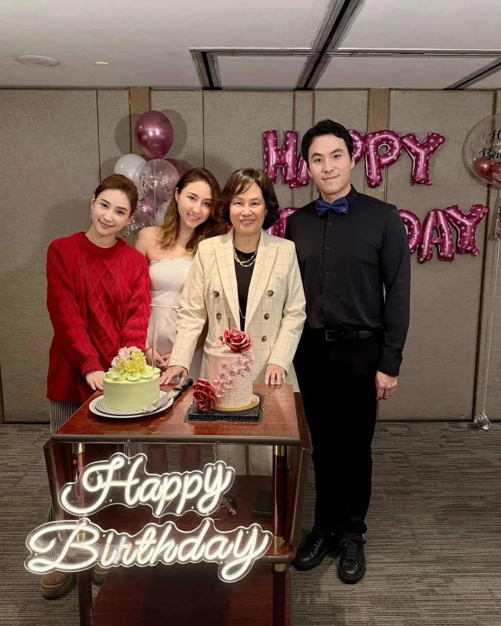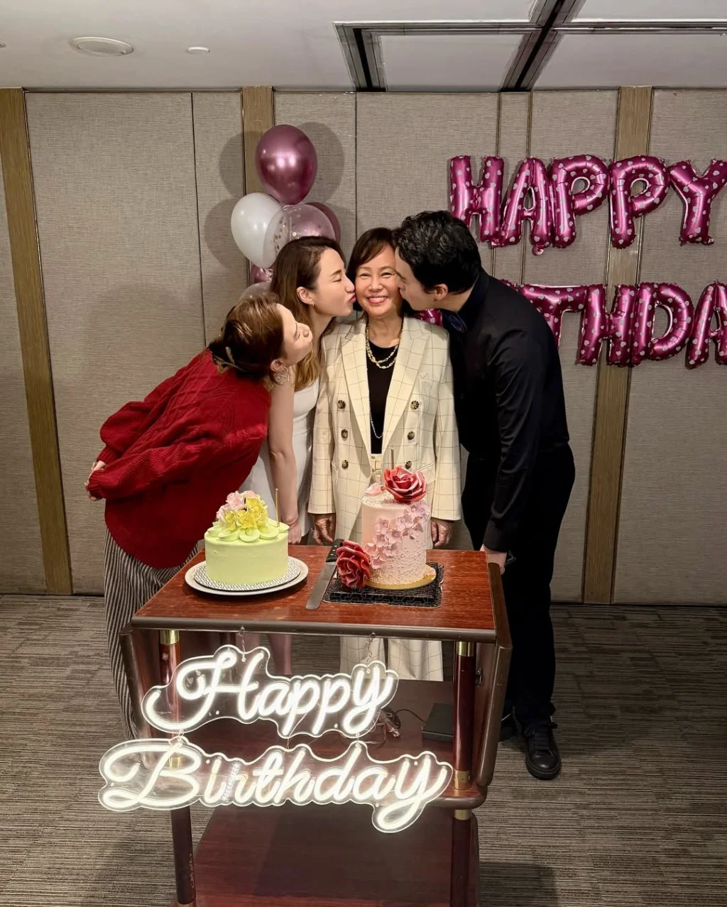 之后的照片就见到其妈妈陈婉珍,三名子女都隆重其事悉心打扮,何超莲穿上红色毛衣喜气洋洋,何猷启就穿上黑色恤衫及西裤,而何超云则着上露肩礼服。陈婉珍在生日大日子也打扮一番,穿上一件方格白色西装外套,内搭黑色羊毛衫,再加上几层珍珠项链,没有太过奢华但就仍然显得雍容华贵。三位乖子女更一起亲向妈妈,让陈婉珍笑得十分开心。