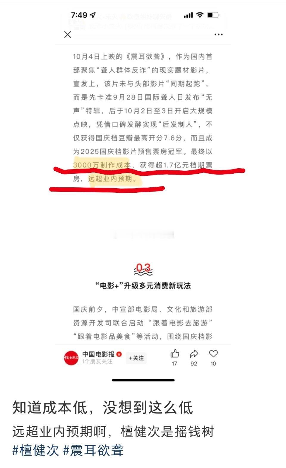 檀健次《震耳欲聋》以3000w的制作成本,获得超1.7亿的票房,远超业内预期