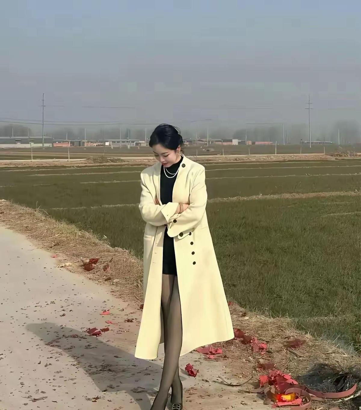 冬日的阳光一洒,田埂上的人先亮了。 不穿白,不堆棉,杏黄衬衫一裹,风都绕着走。