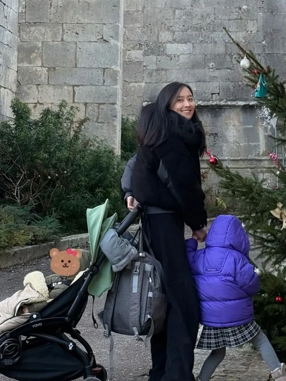 陈法拉今日(26日)晒照,分享一家人在法国度圣诞,她以英文写道:“祝大家有个愉快、平安的假期。”照片可见,一身黑色装束的陈法拉面露蛊惑的笑容,她一只手牵着3岁的女儿米妮,9月个大的儿子坐在她身后的婴儿车上。