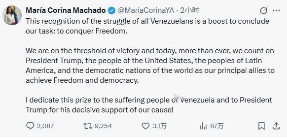 诺贝尔奖还能转让??新晋诺贝尔和平奖得主玛丽亚·科里娜·马查多,发帖说她要把这个