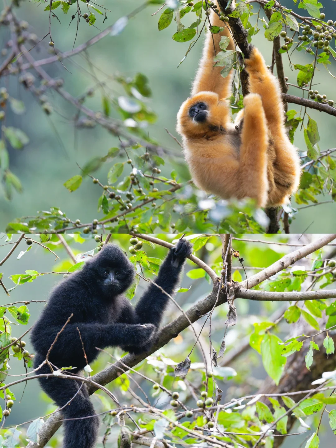 雌性长臂猿和雄性长臂猿在成年后毛色有非常明显的差异,图12为雌雄西黑冠长臂猿对比图。棕黄色的毛发让很多人误把雌猿当作金丝猴,但它们的处境远比川金丝猴艰难太多。虽然全球种群数量只有1500只左右(大部分分布在中国),但西黑冠长臂猿已经是中国长臂猿家族中数量最繁盛的了,其他几种长臂猿数量更少[失望R]