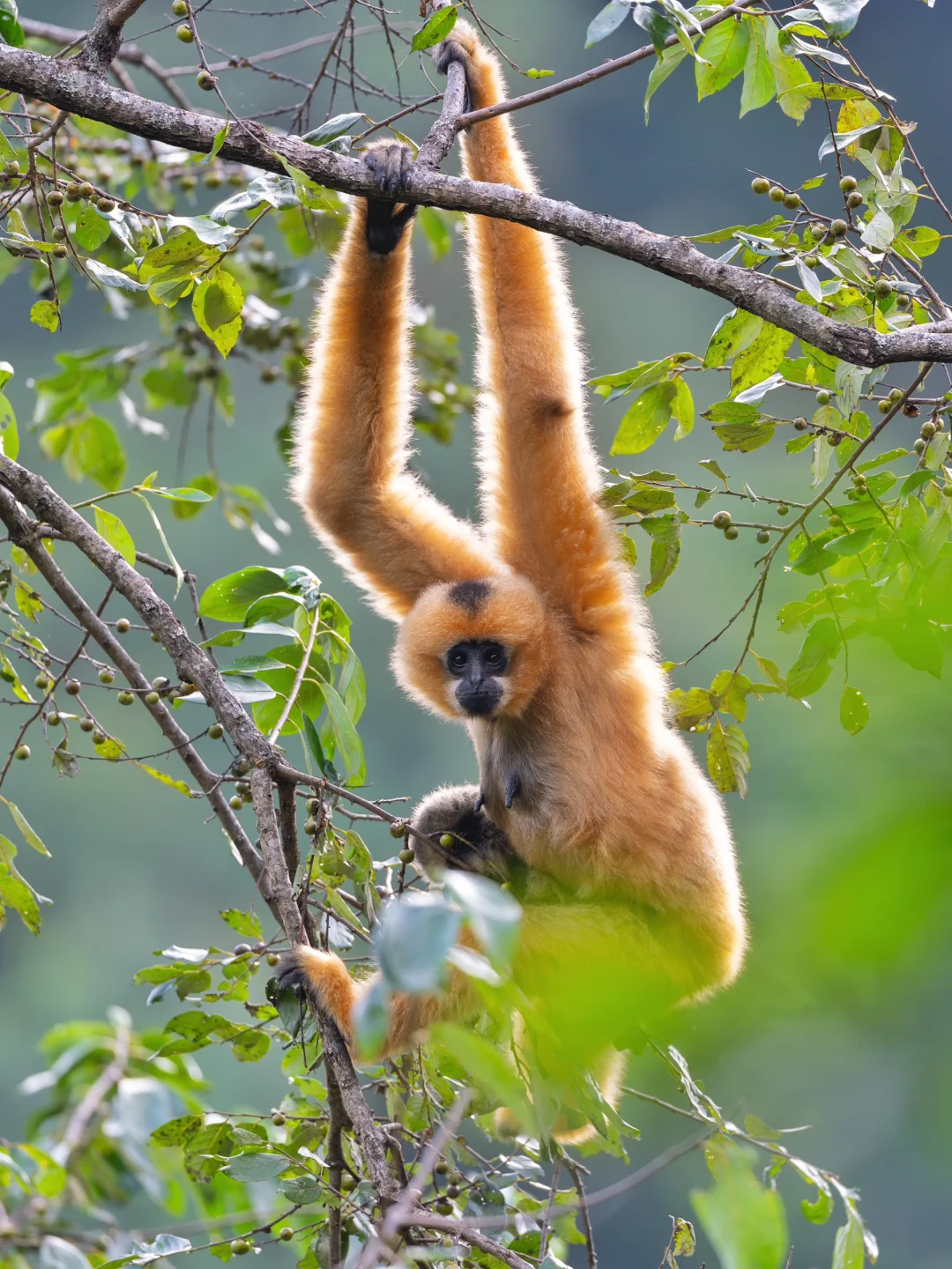 随着树枝的不断响动,西黑冠长臂猿母子出现在了我的视野中,我立刻举起手中的相机,不停按下快门,记录每一个难以复刻的瞬间。由于光线比较昏暗,快门一直保持在1/200s,只为了“赌”到合焦准确的画面。