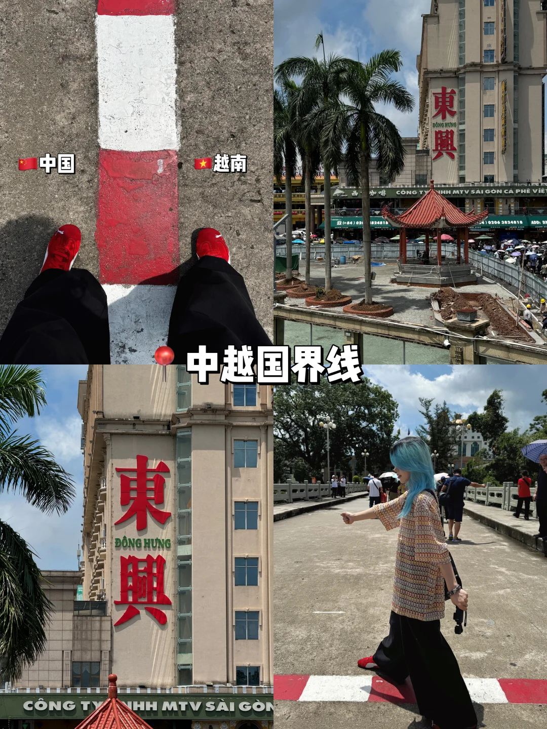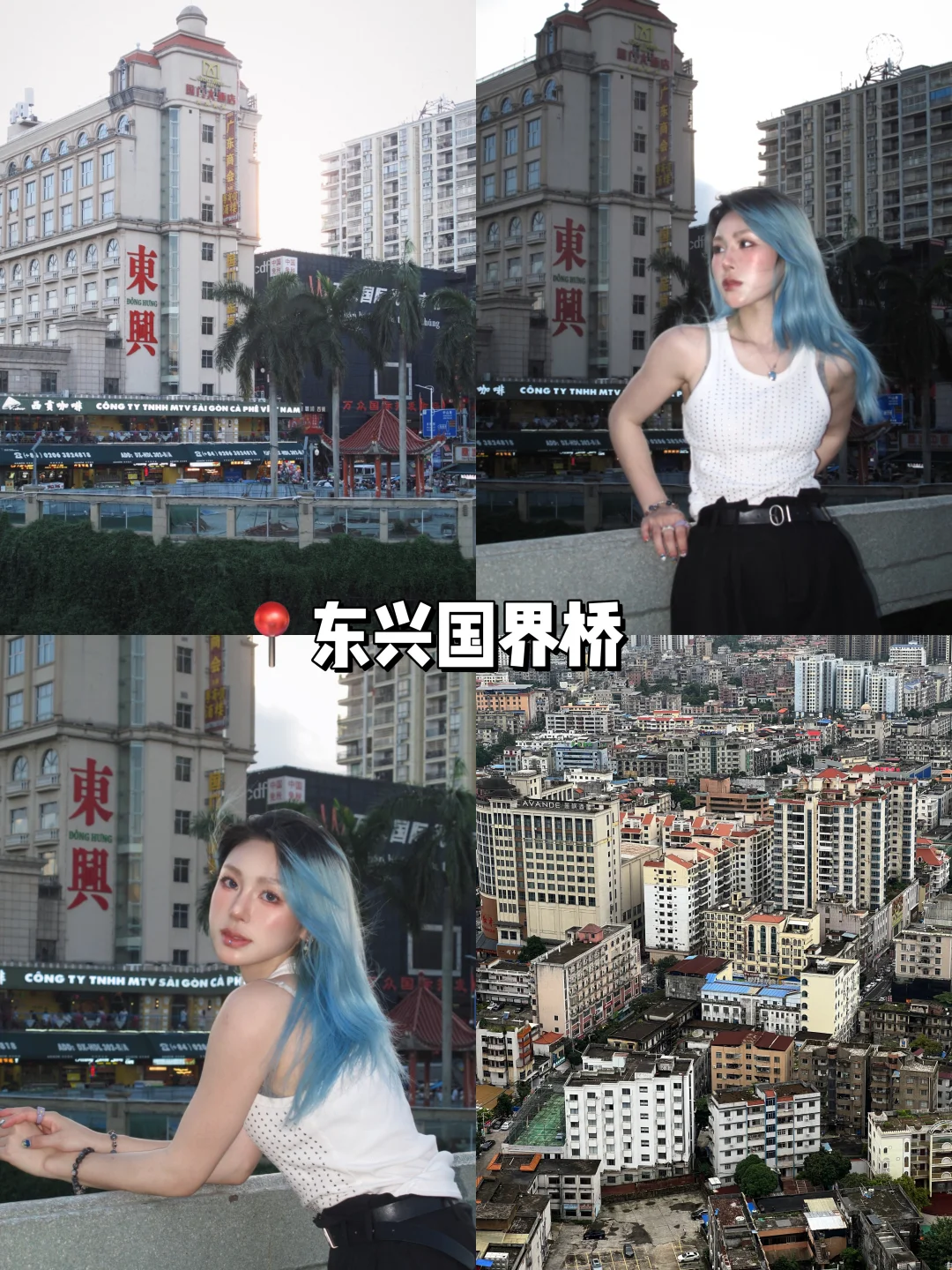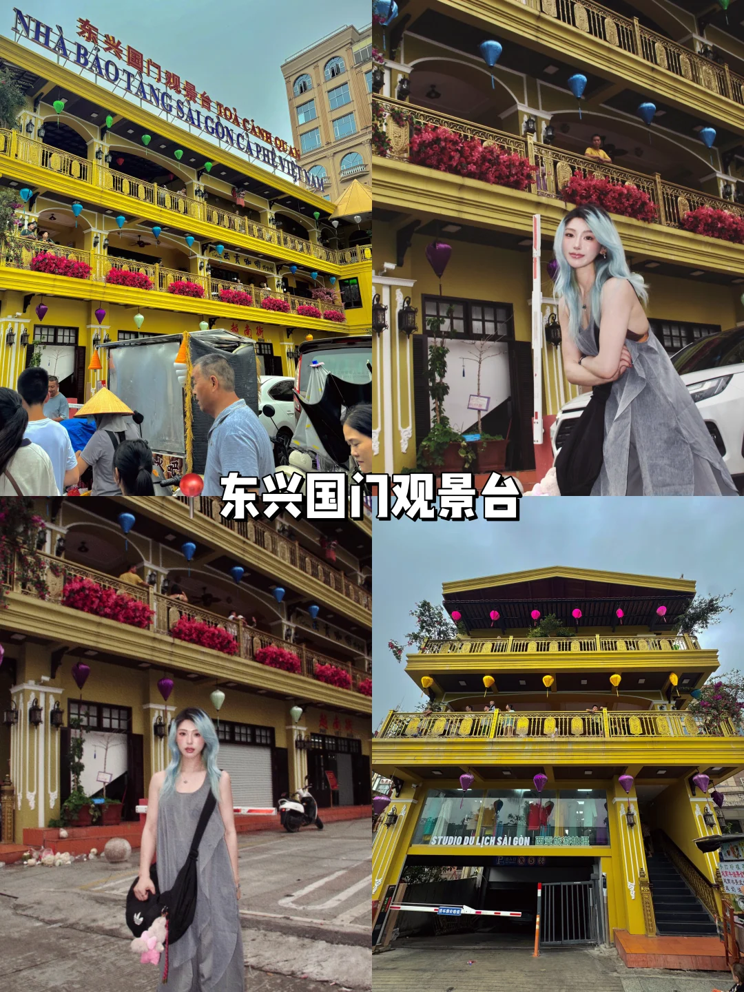 - 红色“东兴”大字墙+停车场路牌(1楼最出片),2楼观景窗俯瞰北仑河。