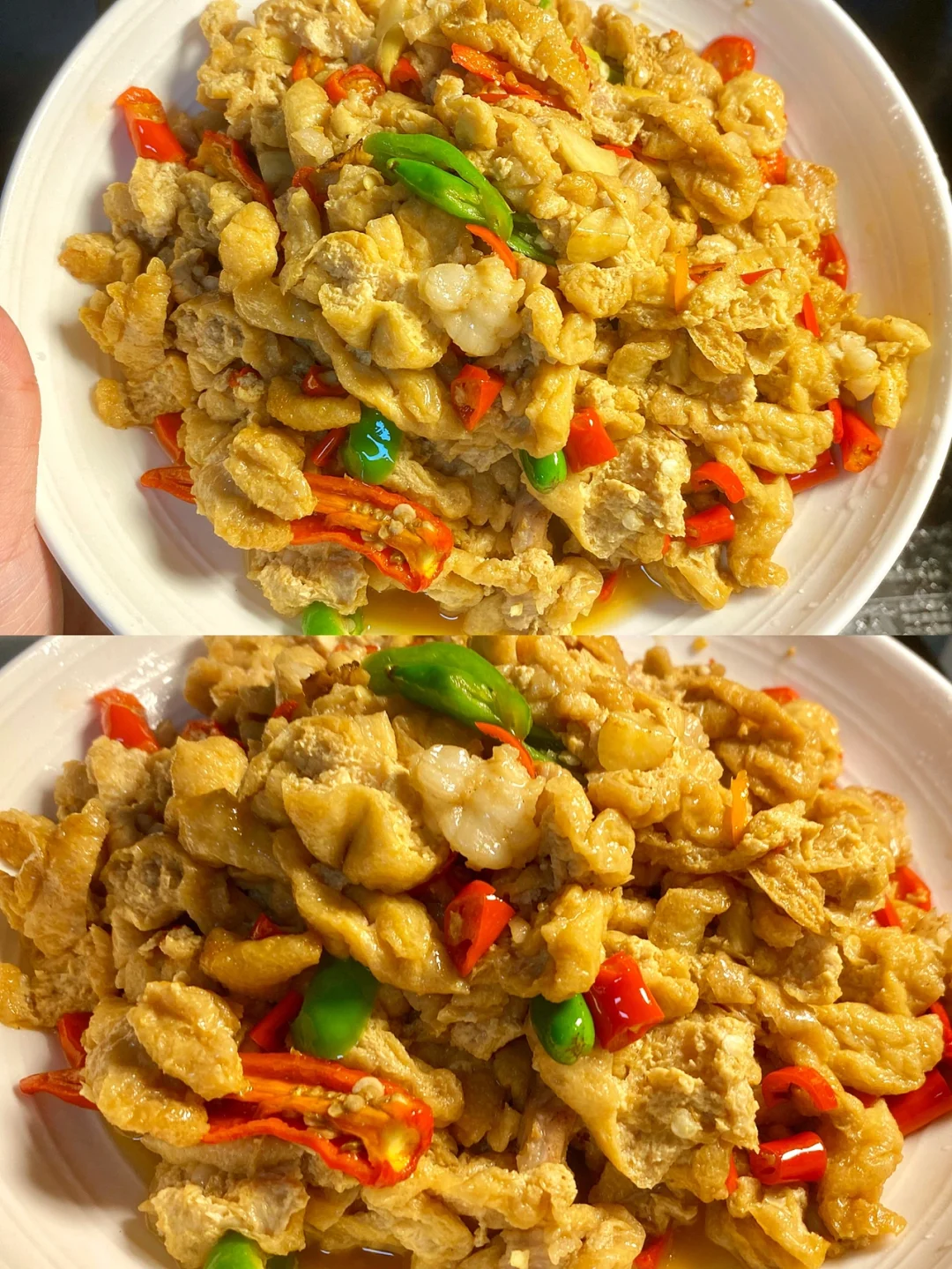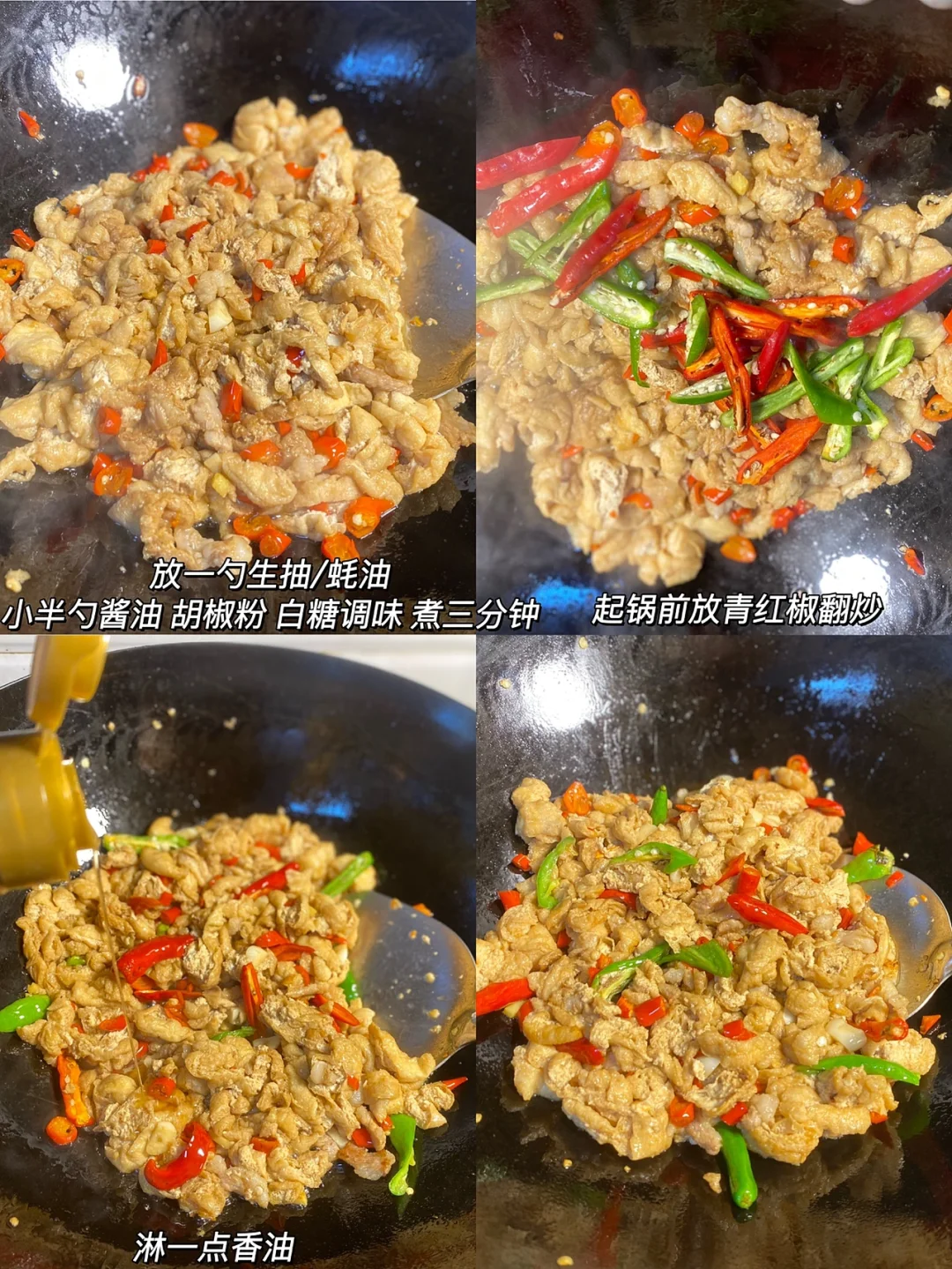 超下饭的菜,还经济实惠[偷笑R] ✨食材:豆泡 前腿肉 姜 蒜 小米椒 青椒 1⃣️:豆泡切成细条,猪肉切小块,姜蒜小米椒切碎,青椒切好备用。锅里倒油烧热放猪肉炒变色,再下姜蒜 小米椒炒两下,放一丢丢酱油上色。 2⃣️:放切好的豆泡,翻炒两下 加一小碗水,一勺生抽/蚝油/小半勺酱油/胡椒粉 白糖 炒两下,转小火煮三分钟 3⃣️:起锅前放青椒 淋一点点香油炒匀。 起锅前尝尝味道不够再加点盐 [飞吻R] 好好吃饭呀🤘🏻