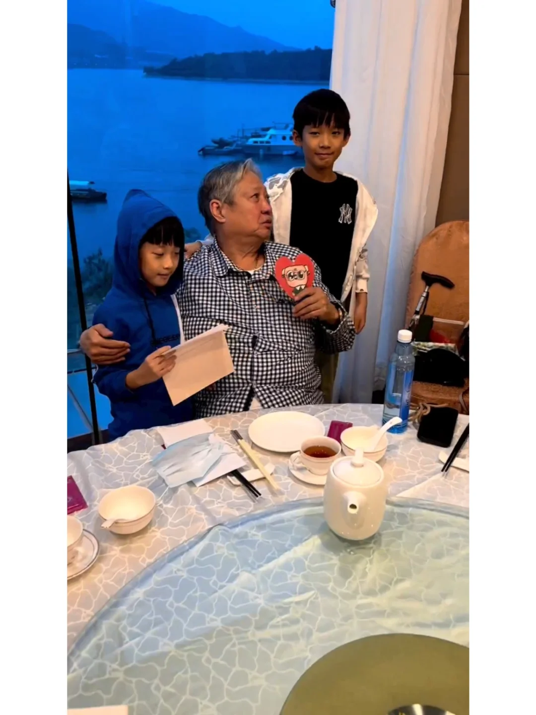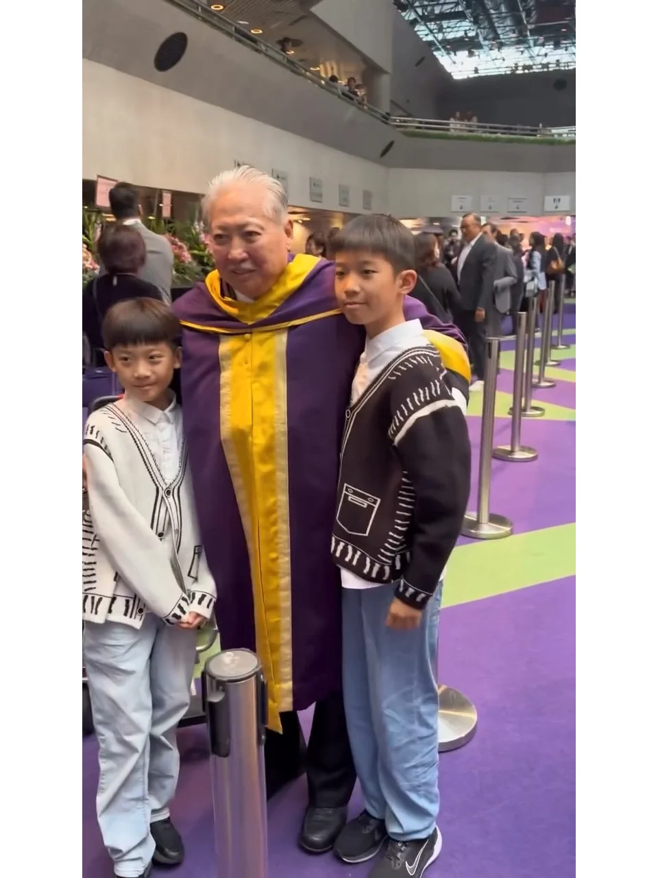 洪天明前日(7日)在社媒发帖,见到穿上西装的洪金宝,与两个孙儿洪大仁(TJ)和洪竟稀(JT)合照,背景估计在影楼拍摄,照片上打上Happy Birthday。洪金宝生日以特别活动到影楼拍家庭照庆祝,他单手搂着小孙子洪竟稀,而大孙子洪大仁则两手搭着爷爷靠在一起,三爷孙笑得相当温馨。