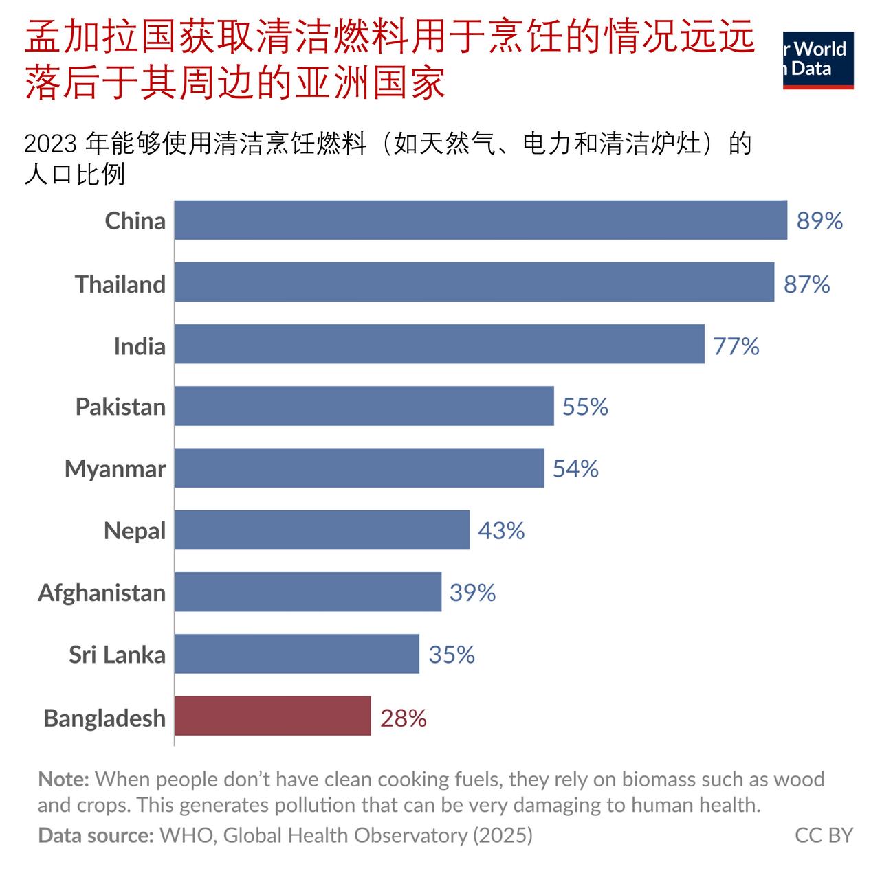 在孟加拉国,获得清洁燃料用于烹饪的机会远低于其周边的亚洲国家 据Our world in data 网,在过去的几十年中,孟加拉国的电力普及率发生了巨大的变化:30 年前只有约 15%的人口能够用上电,而如今这一比例已达到 99%。 但在清洁烹饪燃料方面的进展却远远滞后。只有不到 30% 的家庭使用天然气、电力或改良型炉灶进行烹饪;大多数家庭仍依赖木材、农作物废料或稻草。如下面图表显示,清洁燃料的使用量远低于其亚洲邻国所达到的水平。 这些成本是极其高昂的。使用生物质燃料进行烹饪会破坏森林,并对健康造成损害,因为人们会吸入烟雾和微粒。在孟加拉国,因室内空气污染导致的死亡人数高于低收入国家的平均水平,尽管这些国家总体健康状况通常更差。室内空气污染几乎已成为该国导致过早死亡的最大风险因素。 为何进展如此缓慢?主要的障碍在于经济方面。孟加拉国生产的液化石油气(LPG)极少,而是依赖于价格波动不定的进口。该国缺乏国内的配送网络,这也推高了价格,使得清洁烹饪燃料对消费者来说变得昂贵。孟加拉国的一些邻国(比如印度)已经提供了补贴以帮助家庭进行转换;而孟加拉国却没有这样做,这使得清洁烹饪燃料的可负担性更低了。 文化因素也起着重要作用。生物质能通常被视为“免费”且便捷的能源,而且家庭早已习惯了传统的炉灶及其所产生的味道。他们可能并不清楚这种污染对健康造成的危害,也对诸如液化石油气这类替代能源可能带来的损害持怀疑态度。