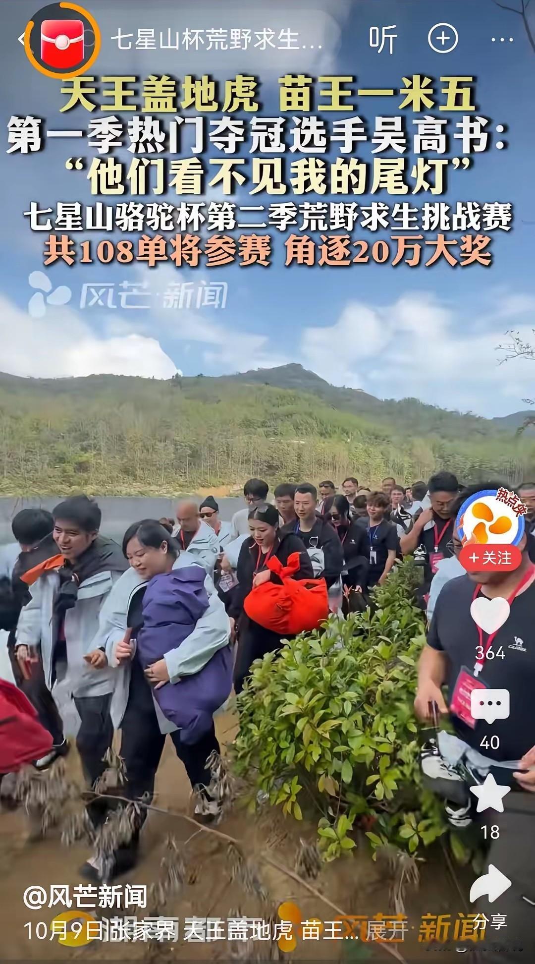 给你20万,让你去荒野求生70天,你会心动吗? 七星山骆驼杯荒野求生挑战赛第二季开幕了,一共108个梁山好汉参加,包括参加过第一季的老选手苗王等。 可是要赚到这20万还真的不容易,且不说那些保护野生动植物不能吃,光一个庇护所搭建和钻木取火就能把很多人劝退,没点技能加身还真的搞不定。 现在天气也冷了,没有火源,没有可以御寒的庇护所,估计已经能淘汰一部分人了。更让人绝望的是,老选手苗王一上来就把漫山遍野的梨摘光了,其他人拿什么比! 本来食材就有限,除了葛根、黄精和野菜,没有别的可吃的。有点狩猎和捕鱼技能的人,还能搞点螃蟹和老鼠补充一下蛋白质,其他人大部分时间只能挨饿。 另外老选手的出现也显得极不公平,他们有老庇护所住着,对地形也熟悉,更知道在哪里可以搞到食材,最为重要的是他们已经适应了场地的环境。 当别人还在水土不服的时候,苗王已经开起了水果超市,拿什么比,直接颁奖算了!但是唯一的变数就是,会不会出现第一季中王大力那样的挨饿天才,靠着毅力扛着,说不定会逆袭!