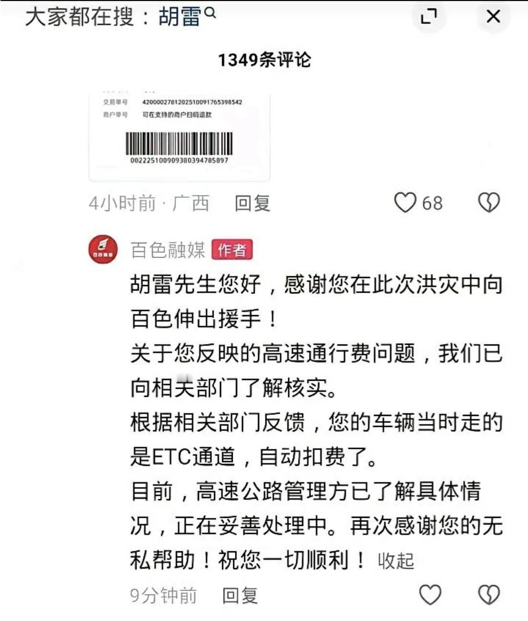 胡雷被收高速费给我们提了个醒 想做慈善,根本不需要包装。 想免费跑高速,一定不要走ETC通道,机器和人工差距还是很大的,特别有些地方的高速不一定是统一管理,如果涉及到多家公司、多个部门,可能免费车辆申请的流程就会有所延迟,如果没有及时录入信息,机器肯定不会给你放行的(这是一种可能性,不一定是这样)。如果是选择人工通道,你就可以和他们说明情况,他们查验完成了,就可以上报,给你走线下申请,这样你仍然有可能免费通行。这样的案例在其他地方已经有先例了,前年河北涿州就有这样的民间救援队伍实现了免费通行。 还有就是像前年去云南昆明,一百多公里的高速公路,中途没有出高速,却要缴费几次,就和当年ETC没有联网的时候一样,谁修的路,谁自己收费。不知道现在改了没有,跑惯了其他地区的高速公路,一时还真不适应,如果走人工窗口,还要更麻烦。 另外这个民间救援想要免费高速通行,是有一个系统可以填报申请的,只要通过了,基本上就没有什么问题了。 不过还有一个关键点,申报和申报通过,申请和申请通过,他真的不一样。 希望遭受灾害困扰的广西,早日恢复正常吧,不要因为某个人而过多的浪费救援精力!你们觉得呢?