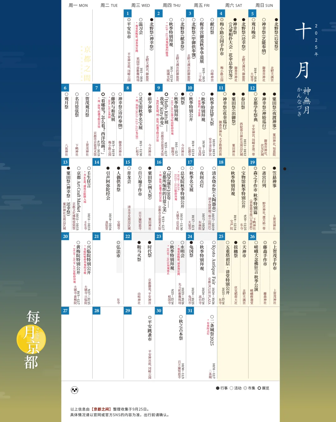 北野天满宫、御香宫神社、西院春日神社等都将在10月迎来大祭,热闹且各有特色