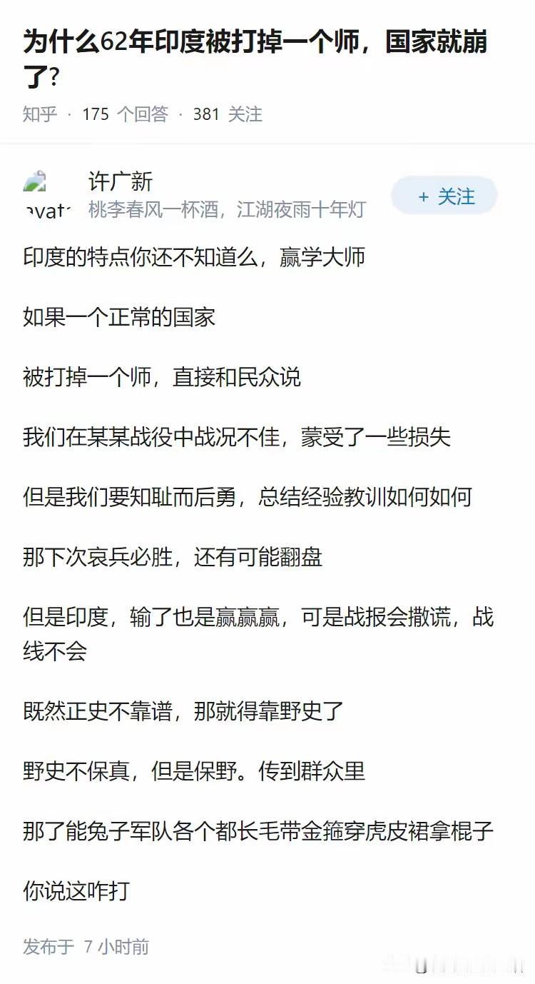 你以为的:剿灭印度几个边防师, 实际上的:印度最精锐部队没了! 印度本以为会乘风破浪,在边境地区占领更多土地,但是没想到,参加过二战的印度几个精锐边防师,瞬间灰飞烟灭了,谁不心慌? 印度外二战时期,属于英国殖民地,所以印度组建数万部队,协助英国在全球作战。好巧不巧,印度军队在英国的指挥下,打出来不错的战绩,这让印度人飘了,觉得战争不过如此。 结果就是印度独立后,觉得不应该在南亚地区称霸,要走英国一样的全球称霸路线。所以印度就开始了向北推进,而那些参加过二战的印度部队,就是在边境地区的前进路线中,蹦的最高也最欢的部队。 不讲对印自卫反击战是怎么打的,反正印度精锐部队被分割包围,几乎是毫无反抗能力,咱们的边防军,一路向南推进,印度直接就崩了,难道又是一起灭国大战? 所以印度现在很有压力,就怕一个突击,又被兵临城下,所以印度又开始当年的前进路线,然后历史再一次重演?