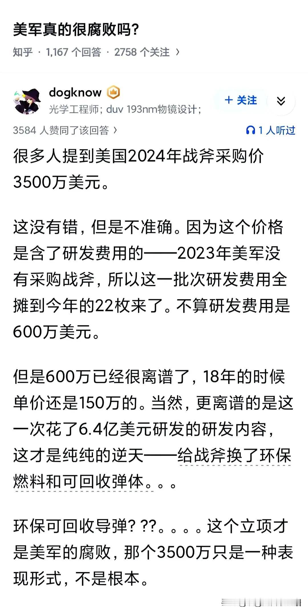 美国至少爆出来一袋螺丝要九万美元的经费,还被美国议员公开数落,但是最终也是不了了之。美国军费高是事实,但是真正有多少用在军费上,那谁能知道呢?美国也是有很多史密斯先生的。 就像战斧导弹的价格猛涨,其余美国装备的价格,难道就不涨了?关于这点涨价,谁都不能说什么,反正涨价就完了。 想当年阿富汗战争期间,川普要派人去阿富汗查账,有结果吗?这美国军队内部的账目,谁敢细查?要知道美国总统只有四年的任期,最多八年,那请问下来了,就不怕有意外?甚至在任上的意外? 不管咋说,美帝到了现在,美军内部的账目,是没法细查的。架子还在,勉强维持就好。再说美国军队在世界各地的军事基地,那也是需要钱的,没钱怎么维持?