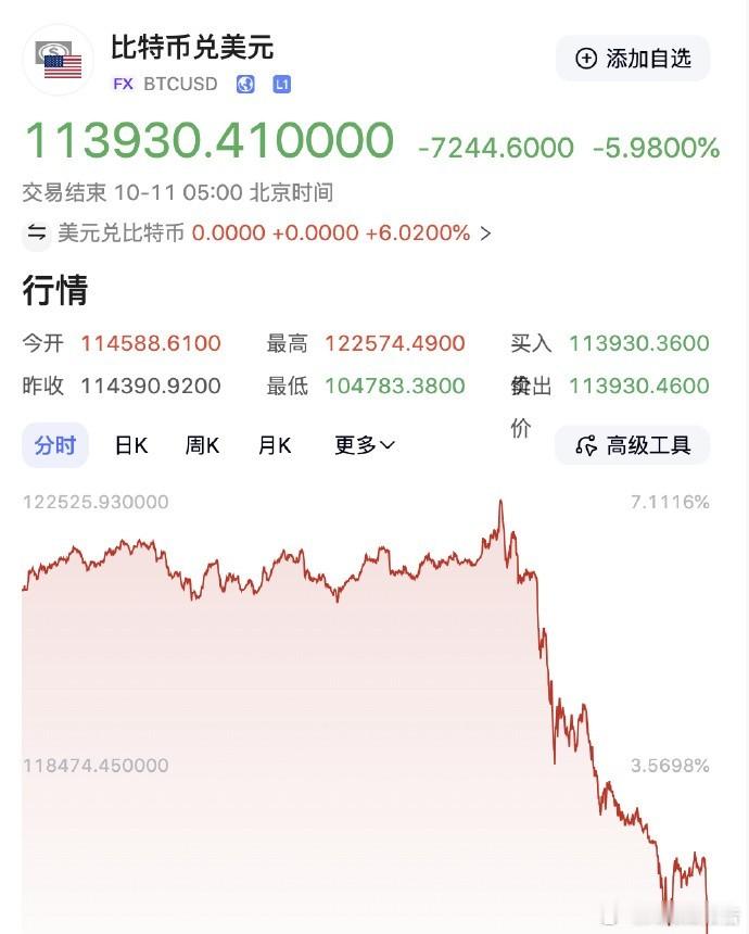 10月11日,财联社报道,比特币向下一度跌破110000美元,过去24小时内下跌9.16%。