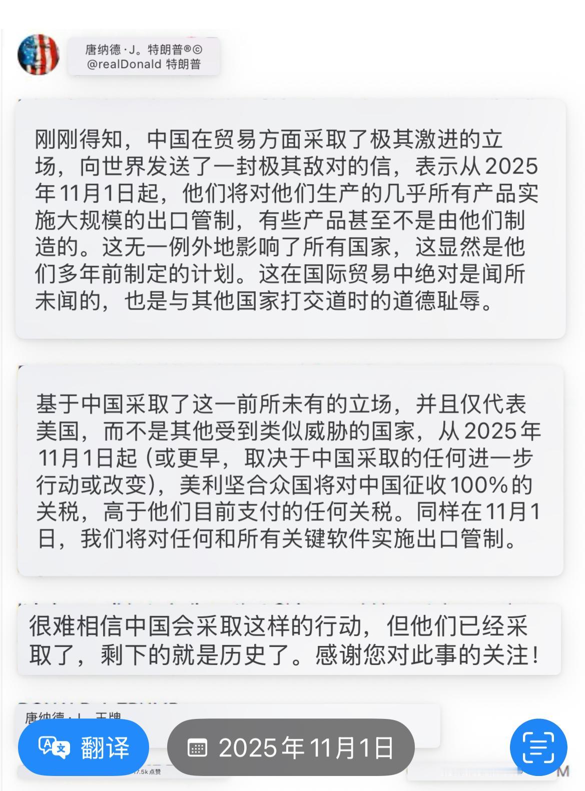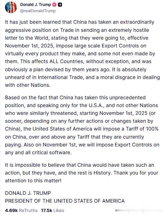 美国又要对中国加税了!此次计划加征100%! 美国计划自11月1日起对我国加征关税,宣称加征幅度达100%,还扬言禁止关键软件出口。 看来,美国又闹起了脾气。美国不仅蛮不讲理,还妄图倒打一耙。自始至终,美国发起的关税战都是其率先出手,对我国进行打压、遏制、抹黑、威胁、恐吓等,手段层出不穷、无所不用其极。而我方只要进行反制,就被其说成破坏规则,这是哪门子道理? 之前中美关税战很激烈,后来有所缓和,这次美国又挑事,估计我国很快会有对等制裁。美国毫无诚意,既想占便宜又不想付出,这种霸凌行径注定不会得逞。 美国时不时的制造谈判障碍,这不仅无法解决中美之间面临的实际问题,还可能使中美关系进一步复杂恶化,彻底堵死中美谈判的大门。还是奉劝美国拿出诚意,同中方相向而行,共谋合作之道。