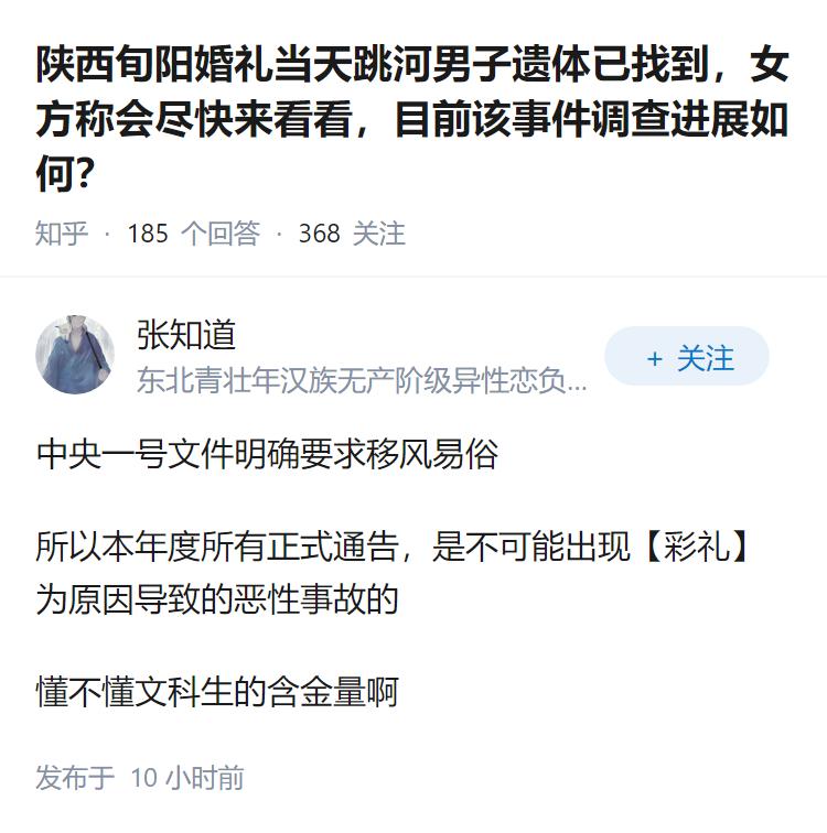 陕西旬阳婚礼当天跳河男子遗体已找到,女方称会尽快来看看,目前该事件调查进展如何?