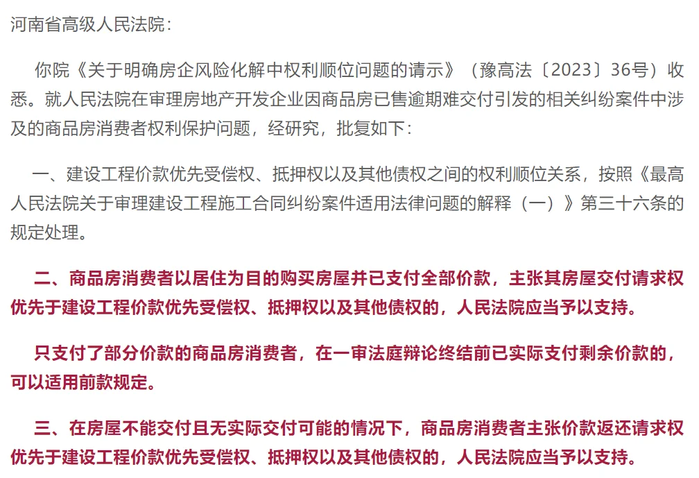 二即当交付风险发生时(即烂尾),开发商需要破产清算时,购房者请求退房形成的债权,同样优先于其他顺位的债权。这里还是有一个问题,若进入保交楼或者交付仍有可能性的情况下,对购房者要求返还房款做出限制。我们知道,直接退房的债权优先级是不高的,一旦退房成功,那可能真的就踩坑了。比如H大的很多购房者,找H大申请了退房,H大同意之后,这时候两者的关系就由房屋交付请求权或者破产清算时的债权变为了一笔合同退款的普通债务关系,这种普通债务劣于包括工程款、抵押权人债权、在内的各类优先债权。退房后,假如保交楼成功,理论上房产和你也没关系了,如果没有保交楼成功,最后清偿时由于退房债务属于普通债务,这种顺位下基本上渣渣也不会剩了。