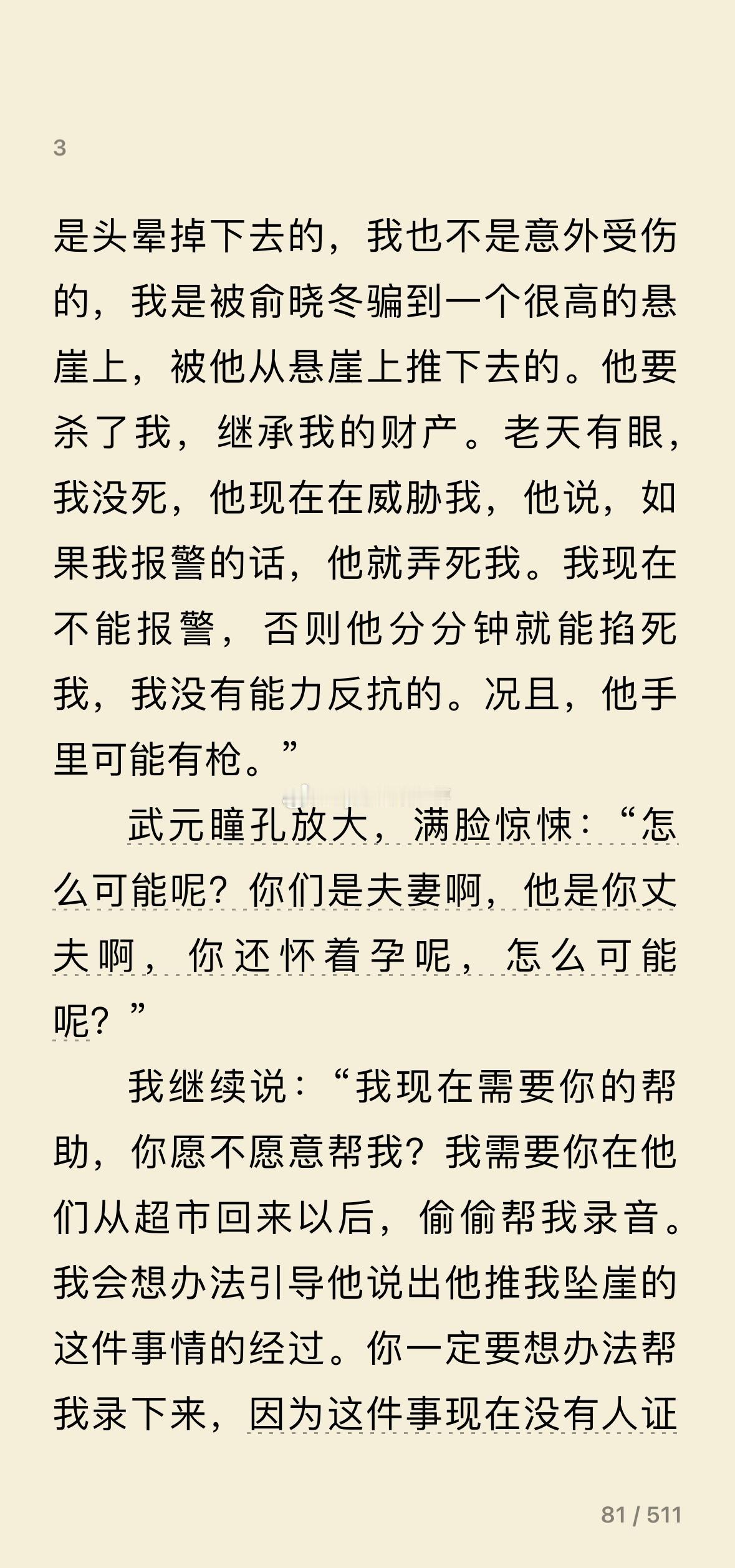 真的不是普通的杀人!不是普通的推下悬崖!一开始男的还想把怀孕的暖暖卖给赌场。 我是把书看完了的,电影也看了。我不知道该说什么,Can问我书里讲了什么,太多细节我都不知道该怎么给人转述。一切都是细思极恐,男的没有心,男的杀人未遂还想反咬一口你让你赔偿巨额离婚款。 买保险等着杀妻继承遗产➡️卖怀孕妻子给赌场未遂➡️带怀孕妻子头一天踩点观察谋杀地点➡️吃掉妻子的泡面把妻子推下悬崖附带一声“你去死吧”➡️开车从泰国回中国继承遗产➡️路遇救护车怕妻子活着便返程➡️一路跟随进医院装什么不知道➡️ICU想再杀妻子➡️强制拔管推床出门被医生拦住➡️威胁妻子想活别供出来他➡️妻子让朋友到泰国引诱说出全部让朋友录音➡️男方妈妈协助男的划走妻子卡里的钱➡️妻子求助医生报警给警察➡️抓住男的➡️男方妈妈把证据偷走大喊冤枉➡️男方被抓死老太带着狱友回中国暖暖家偷窃➡️后边就是一直康复和打官司离婚。 纪录片说暖暖康复在八楼,但是一楼也能听到她的惨叫。 恶人啊,真的要远离。女生啊,也不要太天真