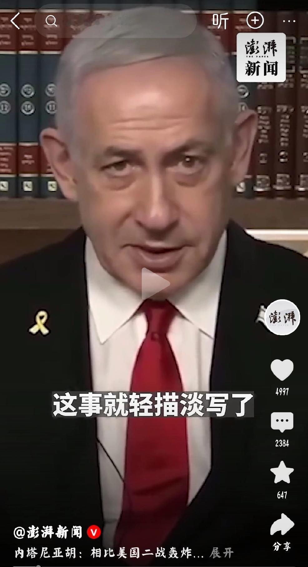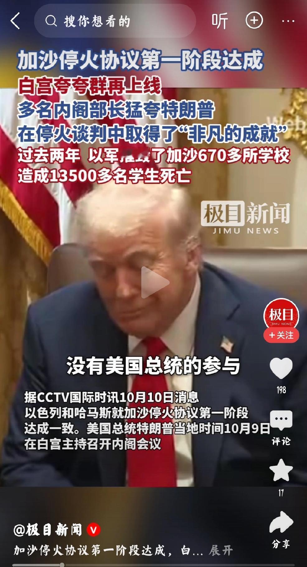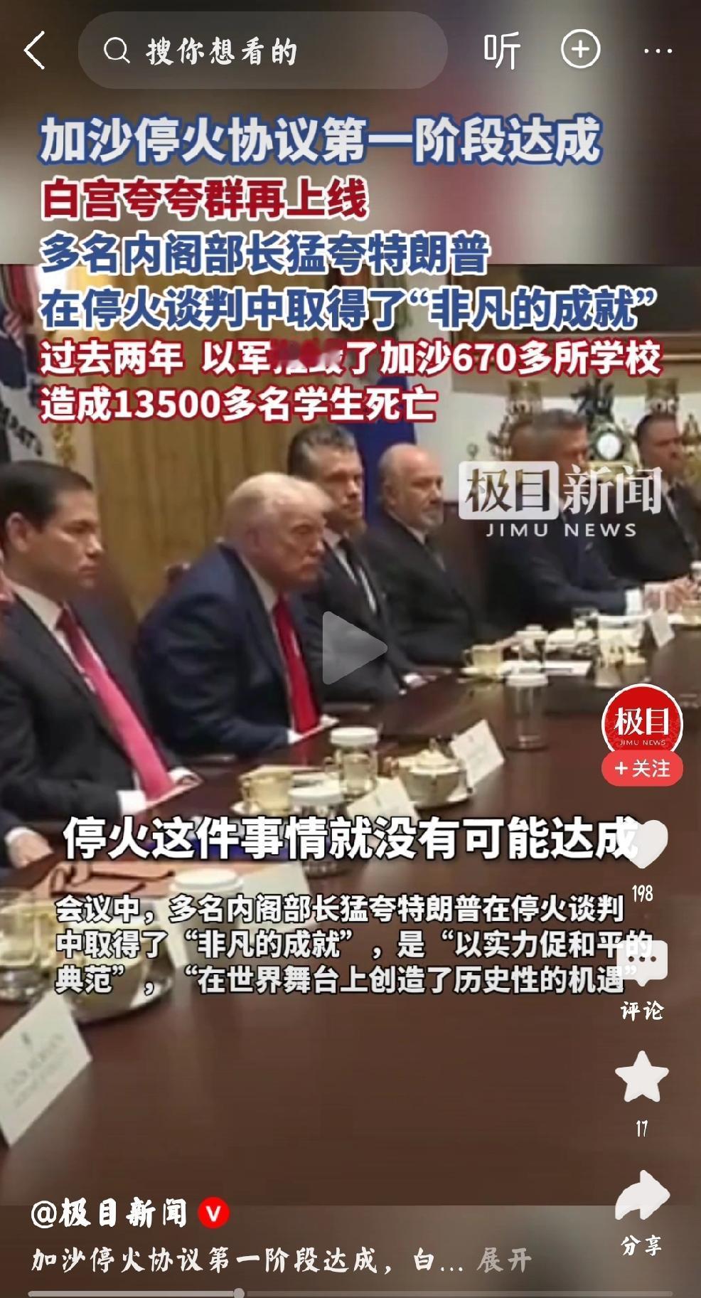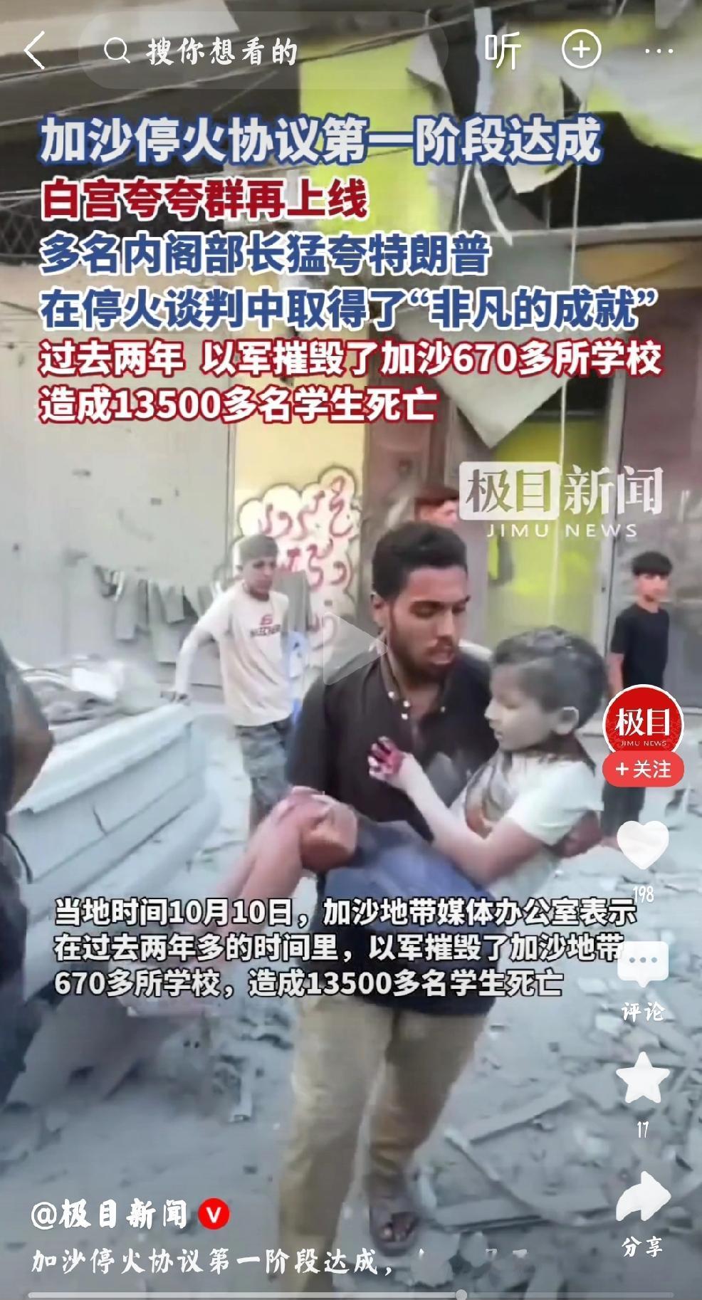 这就是权贵们的嘴脸 个人意见,这就是权贵们的真相,胡说八道而又洋洋得意。比较的是我没有你,屠杀的多,真是难以想象,这是多大的恶意。这是不是就是变相的承认?以色列在加沙实行种族灭绝战争。 而特朗普用霸权威压强迫,各方接受和平协议,是否是真的和平?有待时间的考验,而这满足了特朗普的虚荣心,这真是绝妙的讽刺。美国 以色列