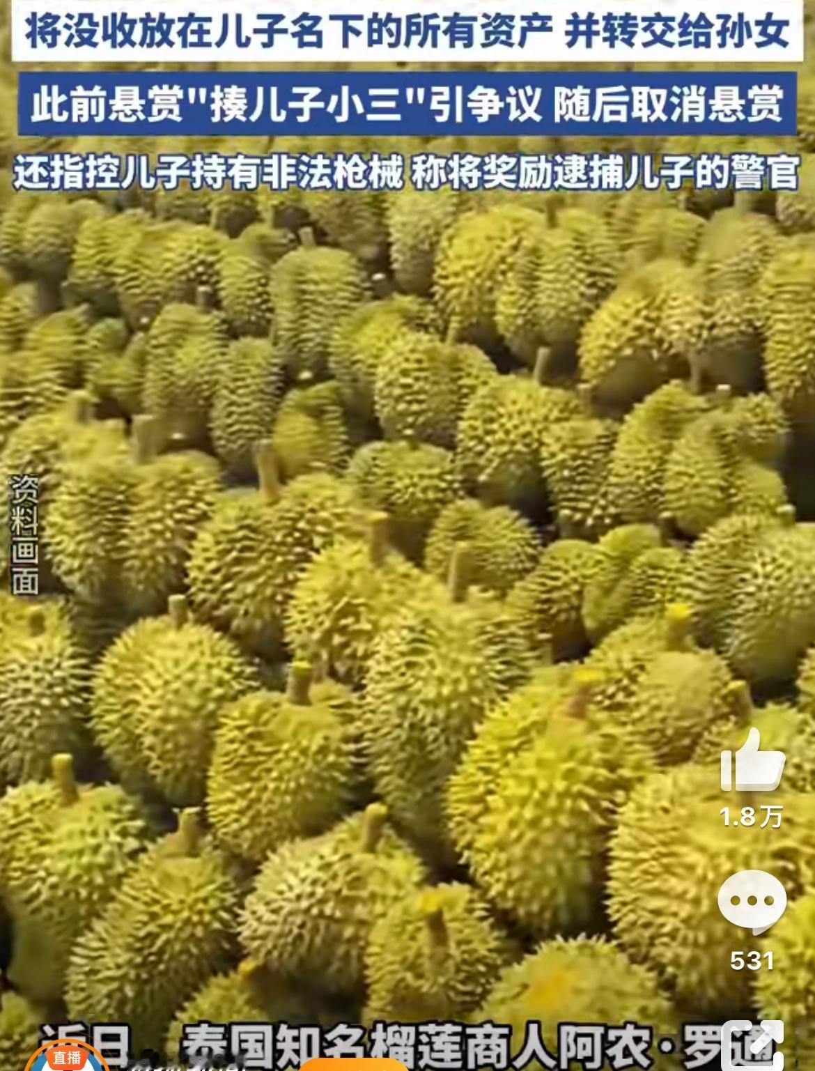 儿子出轨,泰国榴莲大亨阿农罗通一怒之下和儿子断绝关系,收回儿子名下资产,并发布悬赏令3万泰铢揍小三。泰国虽然乱性,但是传统家庭观念依然坚决捍卫,特别是富豪家庭。老爹三观正,难怪能做好榴莲生意。泰国榴莲进入国内这么多年价格坚挺,从来没有起伏过,说明他们对市场的精准把控。品质、量、价格的控制值得国内学习。婚外的私生子 丈夫出轨小三