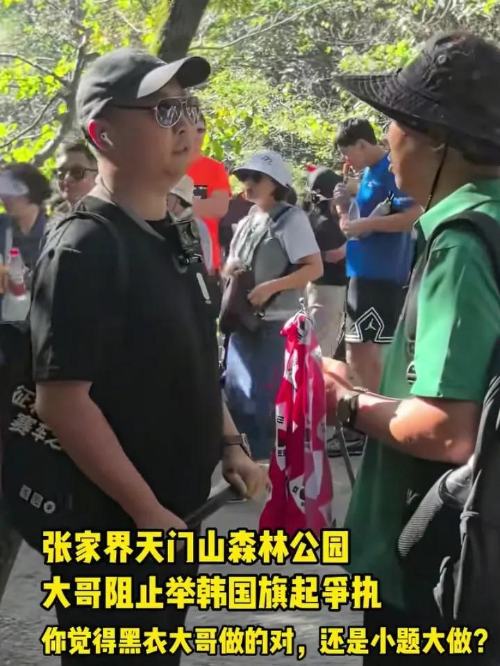 这合适吗?男子举韩国国旗在张家界旅游被“制裁了”,某个黑衣男子拦下不让走,硬是逼迫对方把旗收了起来。 感觉有点小题大做了,主要是人家拿个韩国国旗出来旅游,也不算是挑衅吧?我们不至于连这点气量都没有。 看黑衣男子的打扮和身上的设备,估计也是个主播,不排除是为了流量,但是这样对我们自身影响太不好了。