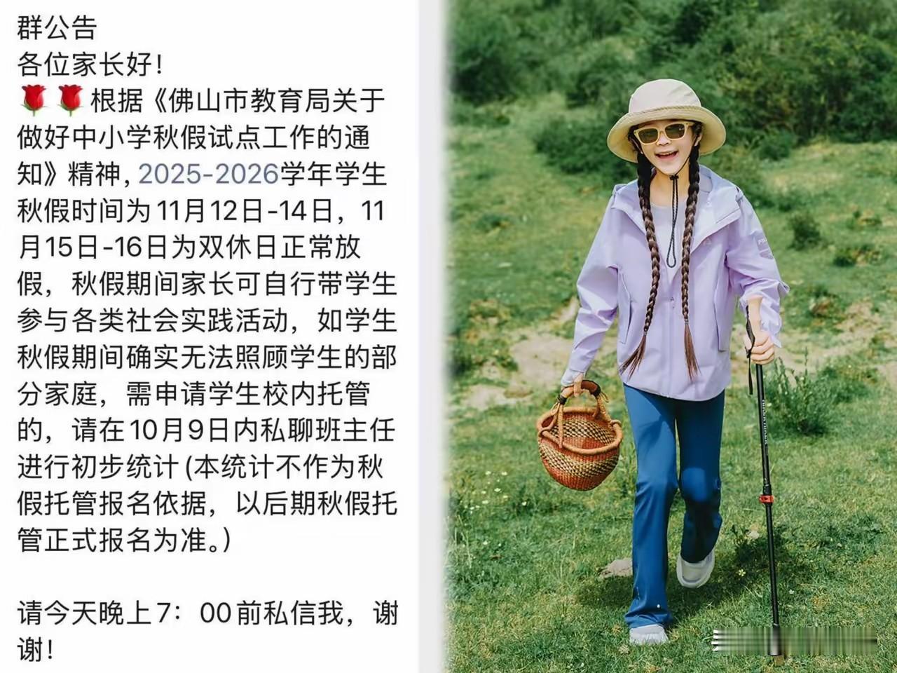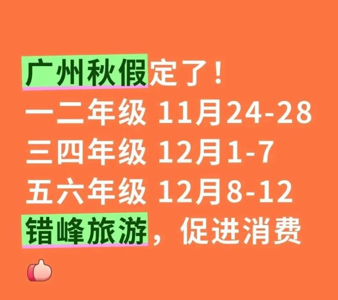 【国庆假期刚过春秋假就来了!】国庆假期刚过没多久,累垮的父母将迎来了首次的春秋假!根据先前的介绍,广州今年开始将会试行春秋假!根据广州海珠区某学校发出的通知可以看到,广州这次的春秋假还是挺有趣的,分成了一二年级、三四年级、五六年级三个不同的实施时间,最早从11月24日开启,最短是3天,如果加上周六日假期的话,最高长达7天。妥妥的又多了一个黄金周长假。 那么孩子放假,家长没有空放假怎么办?这家学校也想好了方案。家长可以二选一,选择 “自主安排” 家庭假期,比如去外出旅游啊,或者返乡之类的活动。如果没有时间的,可以让孩子留在学校,学校将会计划推出为期 5 天的 “秋游 + 项目式学习” 综合实践活动。 可以这个学校提供的方案还是挺暖心的,没有一刀切。不过想到研学,大家应该都清楚,平常一天的没住宿的研学外游都得上百块,这一个持续5天的秋游,加上住宿和伙食,价格不得上千块去了。 好在,本次广州市教育局在《2025-2026学年广州市义务教育学校校历》中明确“鼓励有条件的区结合实际探索设置中小学春秋假”,也就是说不会强制学校搞春秋假,有条件的可以搞。 不过个人觉得,如果春秋假搞成研学的话,估计应该会有一波“聪明人”看上了这里面的油水,各种游说学校搞春秋假,到时候就不是自选的问题了。 大家支持学校搞春秋假不?
