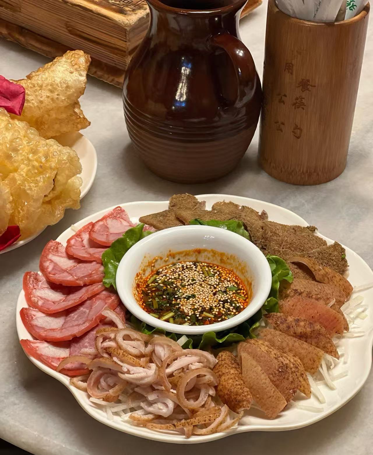 2️⃣.生肉,特色的牛肉+腊肉+猪皮一起拼,焦香流油,蘸着酱汁一起吃。