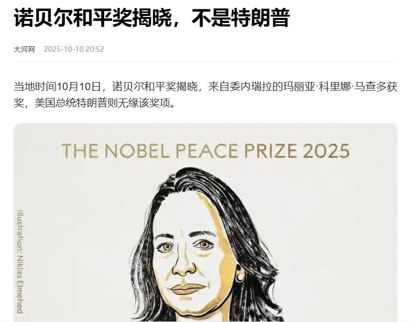 特朗普“遗憾”落选诺贝尔和平奖,所有作秀都成了无用功! 特朗普从上台后的这几个月里,为了能拿到诺贝尔和平奖可没少下功夫,又是公开吹嘘自己的"和平功绩",又是让团队四处运作,没想到10月10日奖项揭晓,呼声挺高的他居然落选了,最终获奖的是委内瑞拉的科里娜·马查多。 这一下,特朗普团队之前的所有折腾都成了国际上的笑料,场面别提多尴尬了。 要知道,特朗普之前总在公开场合说自己"解决了七场战争",那语气仿佛自己就是拯救世界的和平英雄。可只要稍微查一查实际情况,就知道这些话里水分实在太大。 真正能和美国扯上点关系的,也就只有最近巴以暂时停火这件事儿,美国在中间起到了些协调作用。至于其他几场冲突的结束,要么是冲突双方自己谈妥的,要么是很多国家一起帮忙推动的,跟美国没多大关系。 这种把别人的功劳硬往自己身上贴的做法,本来就站不住脚,诺贝尔委员会当然不会认可。 但这场颁奖的事儿并没因为特朗普落选就结束,反而让人看清了诺贝尔和平奖更深的问题——它早就被政治因素给缠上了。 这次获奖的科里娜·马查多,背景一点都不简单。公开资料显示,她曾经接受过美国国家民主基金会的资助,而这个基金会在国际上一直被指责经常插手别的国家的内部事务。 更关键的是,马查多现在还在委内瑞拉的制裁名单里,大家都知道美国把她当成了在委内瑞拉推动政权更迭的关键人物。把和平奖颁给这样一个争议这么大的人,任谁都会怀疑这个奖项到底公不公平,反而坐实了它偏向某些政治立场的说法。 明眼人一看就明白,这背后还是美国两党打架的延伸。特朗普是共和党这边的,他对外的那些政策和民主党想的完全不一样。 而诺贝尔和平奖尽管宣称自己中立,但在情感上还是更偏向民主党哪一派的。当一个本该象征和平的奖项变成了政治势力互相较劲的工具,那它代表的和平意义就大打折扣了。 所以说,特朗普落选与其说是他没做出够格的和平贡献,不如说是他的政治立场不符合某些人的预期;而马查多能获奖,也不是因为她真的在和平事业上有多突出,更多是因为她符合了一些势力的利益需求。 这场颁奖风波就像一面镜子,一方面照出了特朗普为了获奖搞政治作秀的狼狈样子,另一方面也映出了诺贝尔和平奖光环下面藏着的阴影。 和平本来是件超越政治私利的大事,是所有人都该尊重的崇高追求,可如果任由这个奖项被政治牵着鼻子走,最后只会让它自己的公信力越来越差。 现在特朗普的作秀已经暂时收场了,但明年他也许还会再度“被推选”,怎么才能让诺贝尔和平奖回到它最初的样子,真正去奖励那些为和平做出实打实贡献的人,这还真是个需要好好想想的问题。