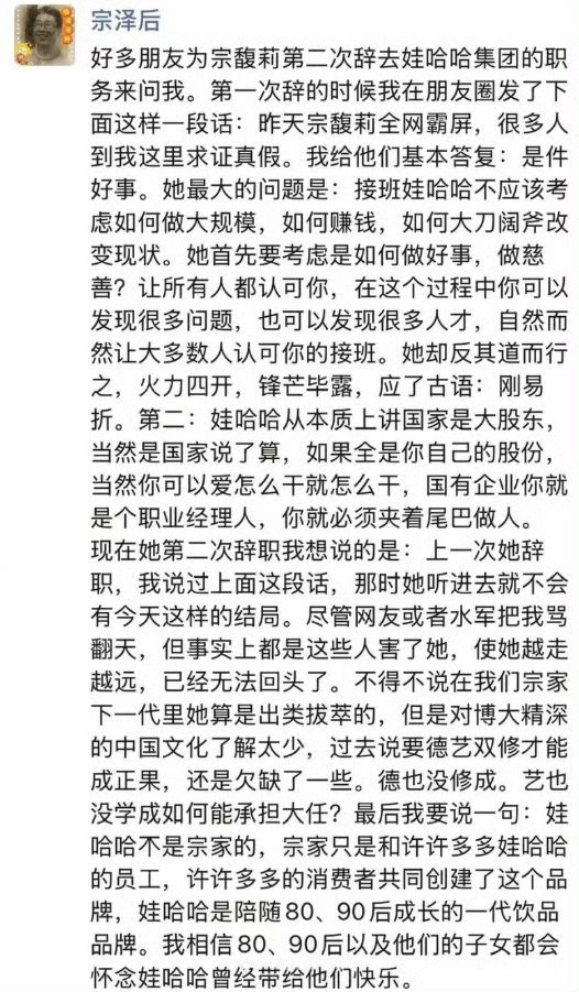 宗泽后回应宗馥莉辞职宗泽后的发言算是比较正常的。而那些追捧所谓大女主营销的网友反