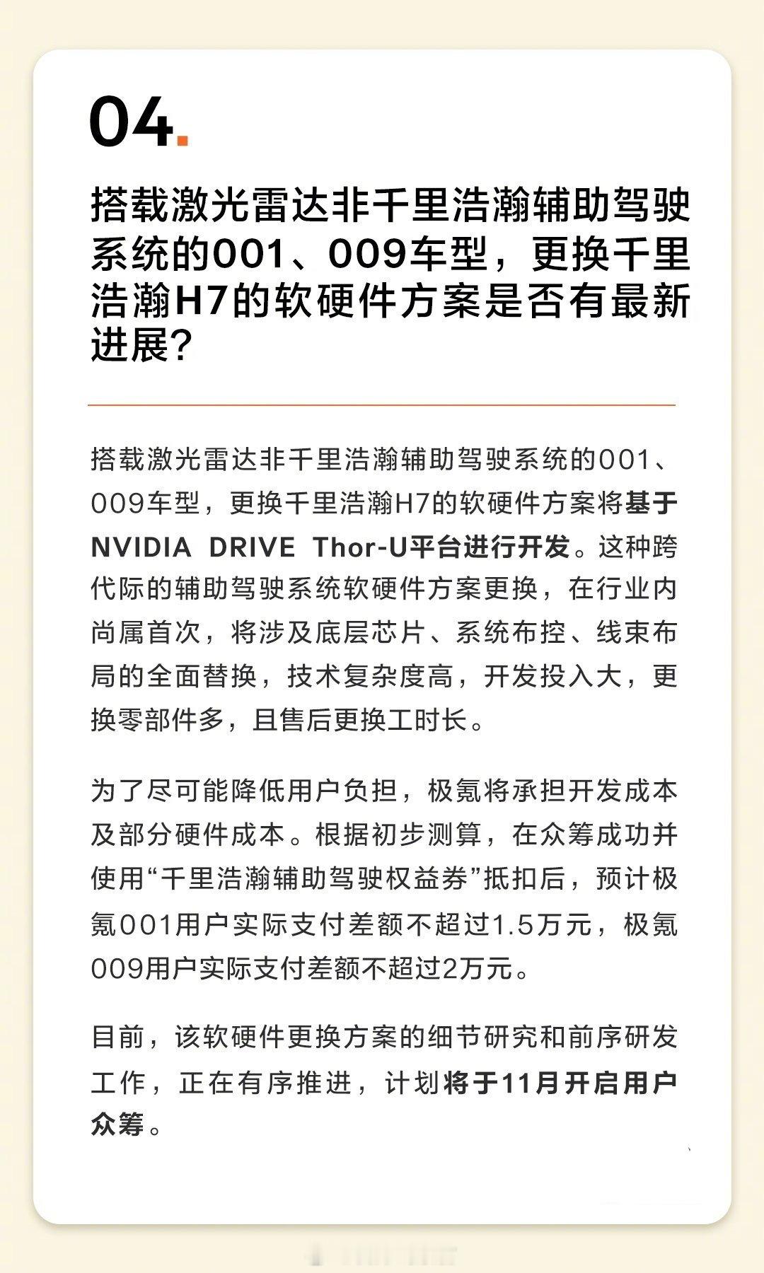 极氪老款激光雷达 001/009 车型下月开启“千里浩瀚 H7”辅助驾驶升级众筹。