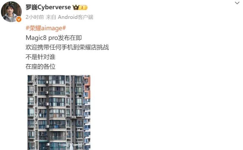 荣耀影像负责人罗巍表示,荣耀Magic8 Pro发布在即,欢迎大家携带任何手机到荣耀店挑战,不是针对谁,而是针对在座各位。不管哪家友商影像实力对比荣耀都没有什么优势,而且这还只是Pro版,荣耀三年内让友商连车尾灯看不见。